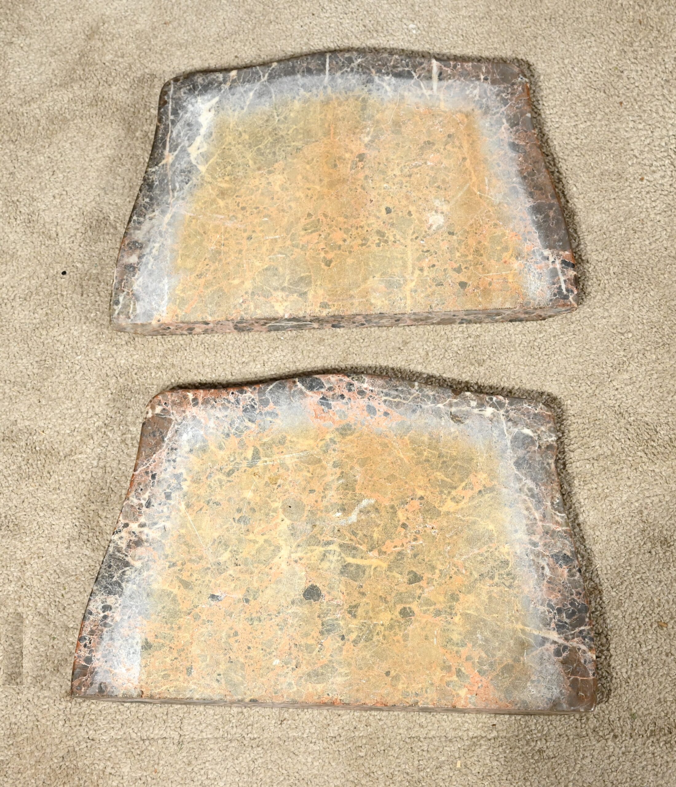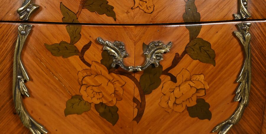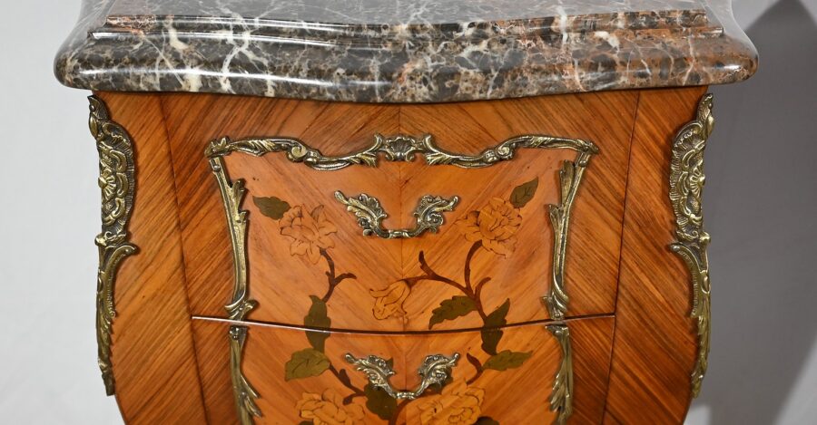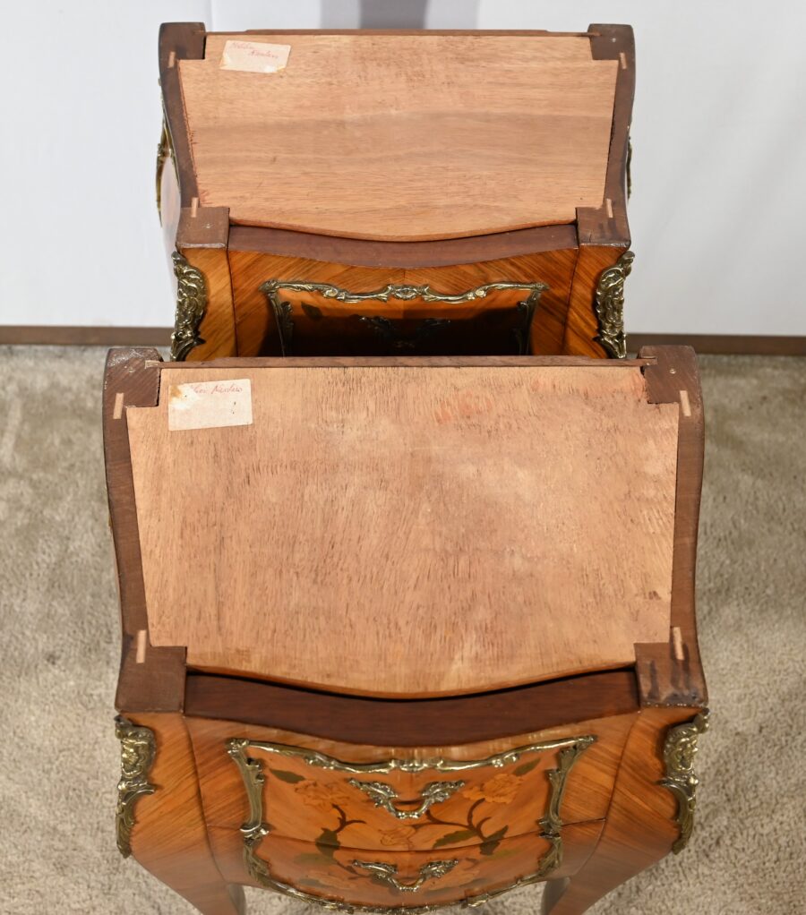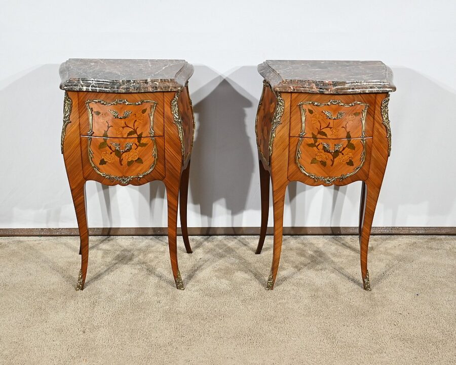 Belle paire de chevets galbés en façade ainsi que sur les côtés, sommés d’un marbre brèche des Pyrénées d’origine avec bec de corbin et disposant de deux tiroirs. La façade de ceux-ci est en placage de bois de rose disposé en diagonal et agrémenté d’incrustations de marqueteries de bois clair et teinté formant un charmant bouquet de fleurs. Cette marqueterie est entourée de garnitures en bronze figurant des branchages et des fleurs. Une poignée en bronze finement ciselée permet l’ouverture de chaque tiroir.
