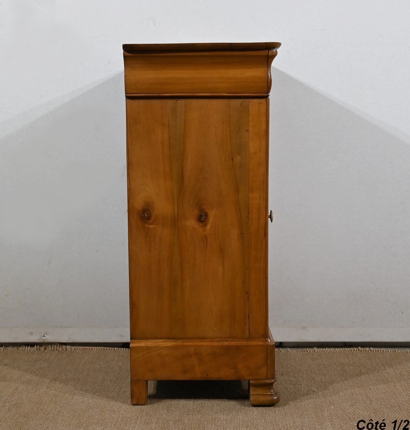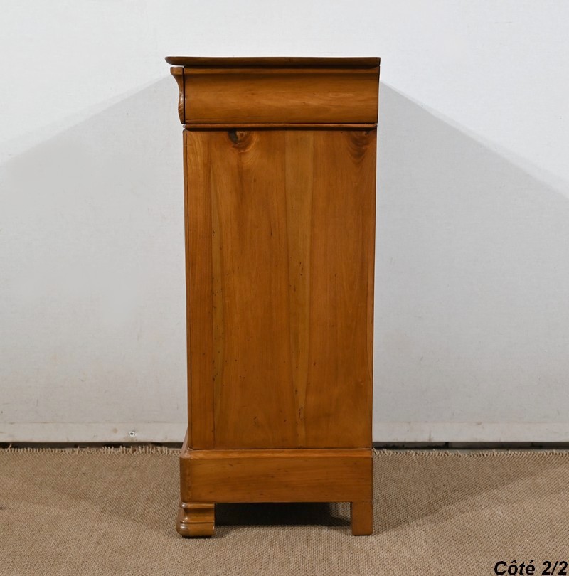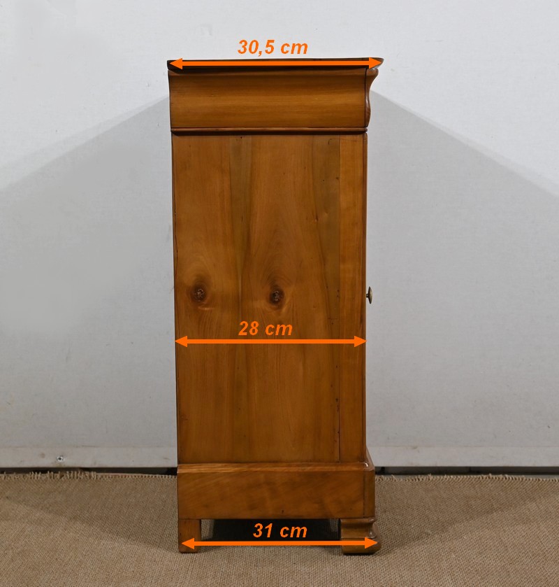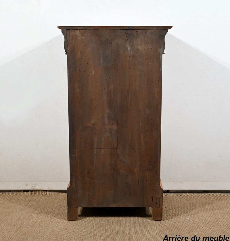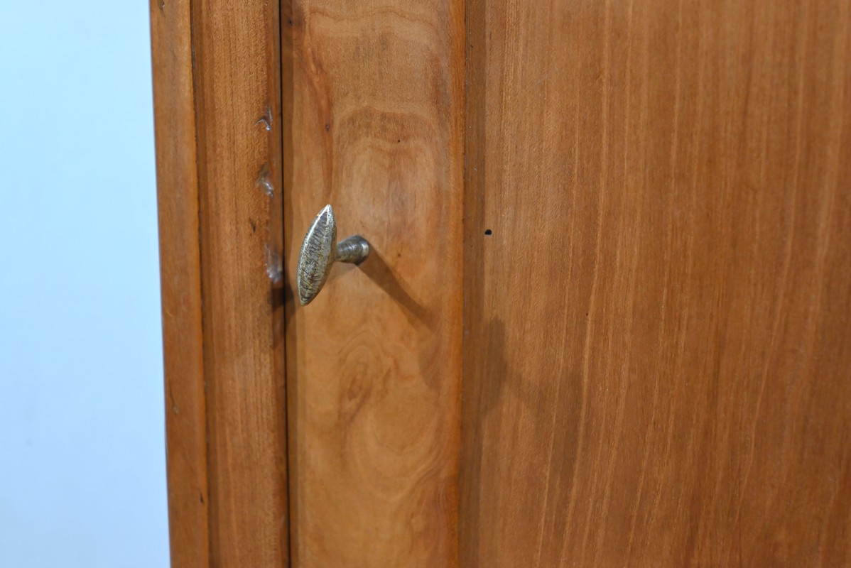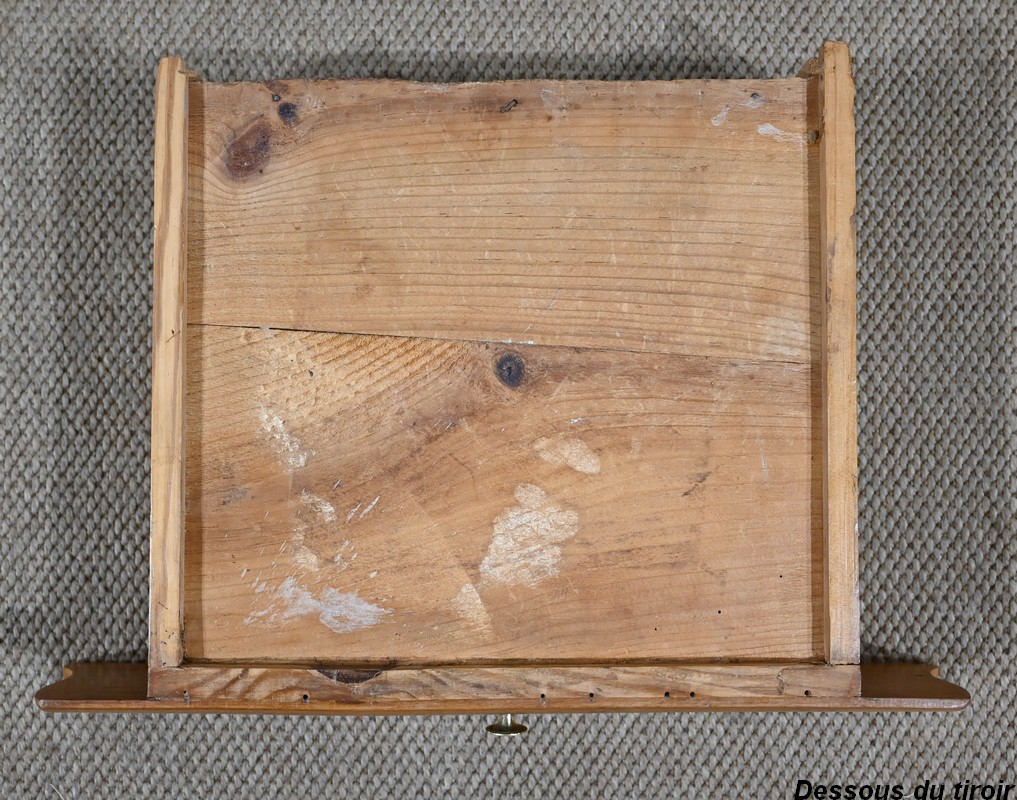 Ce meuble s’ouvre sur une porte, à bouton ovalisé, à cadre légèrement mouluré et flanquée d’un panneau.