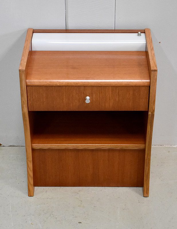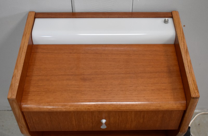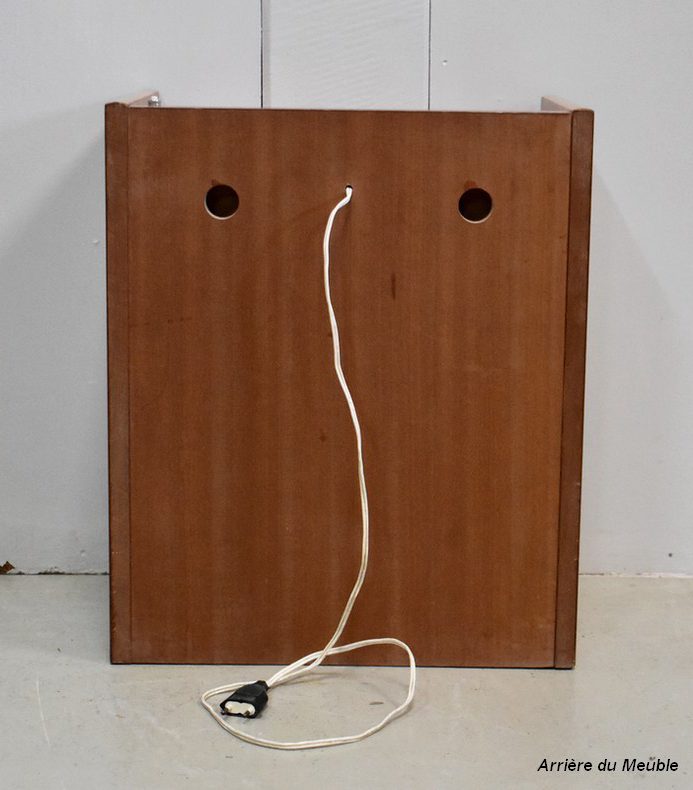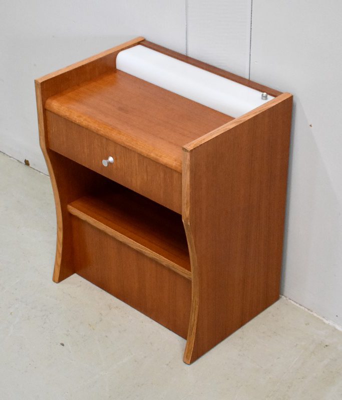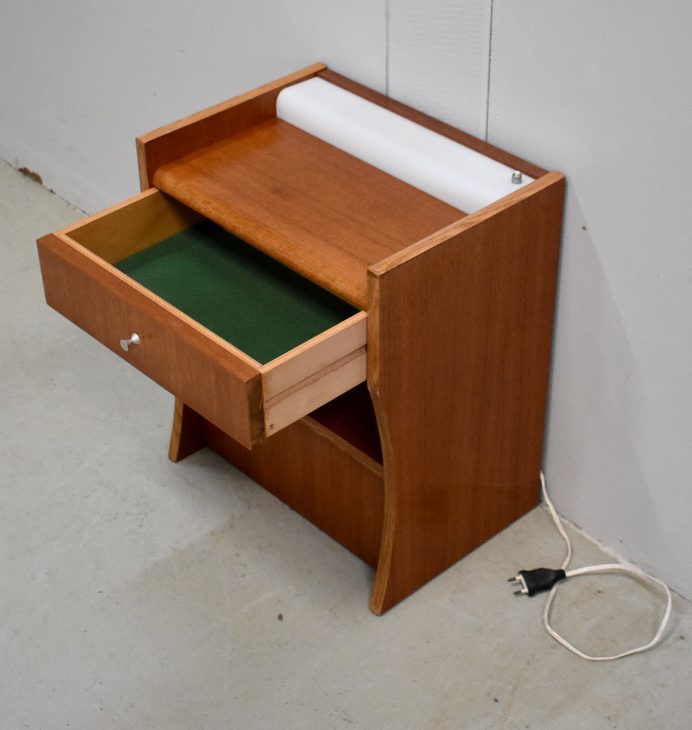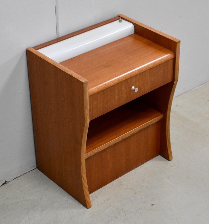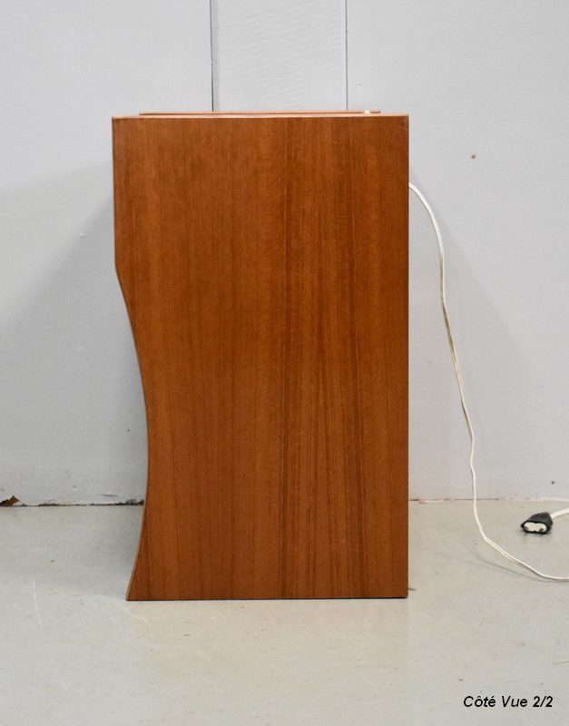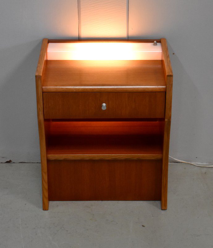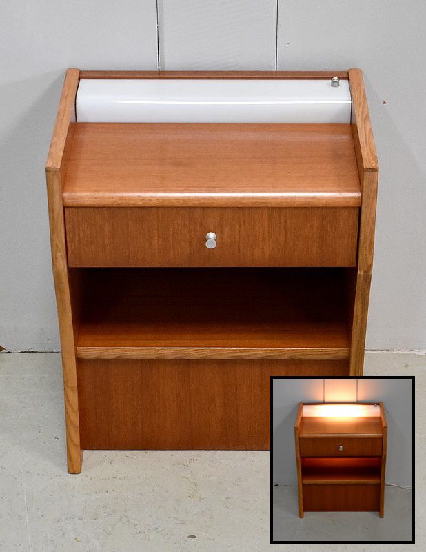 Ce Chevet en Teck des années 70 présente sur la partie arrière du Plateau un Système d’éclairage résolument Vintage avec son Cache de couleur blanche et son Bouton-poussoir pour la mise en lumière.