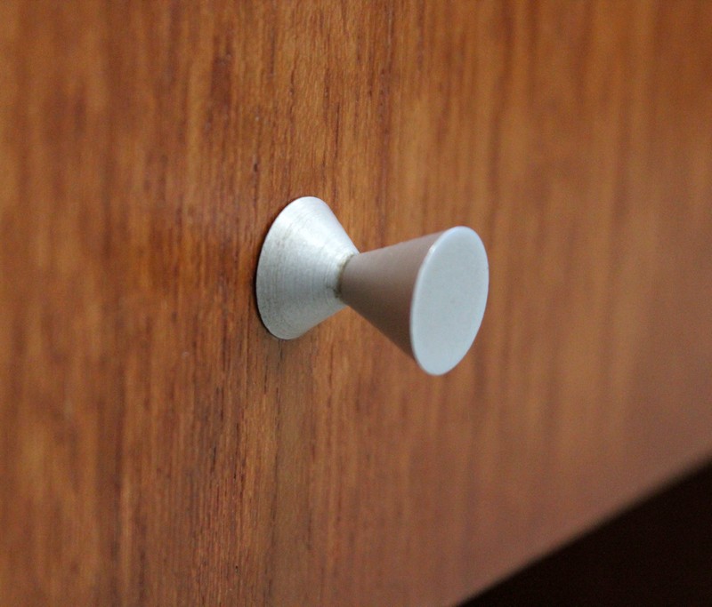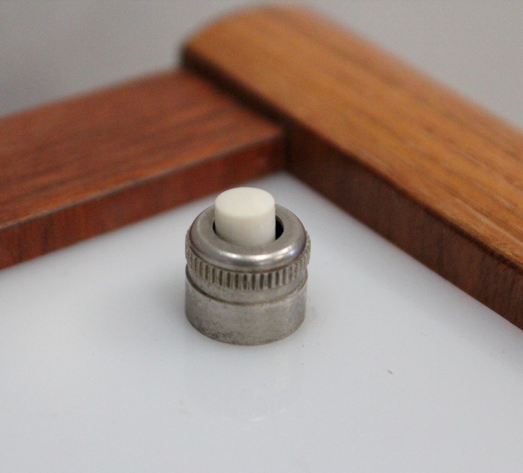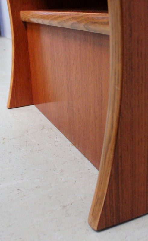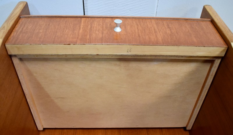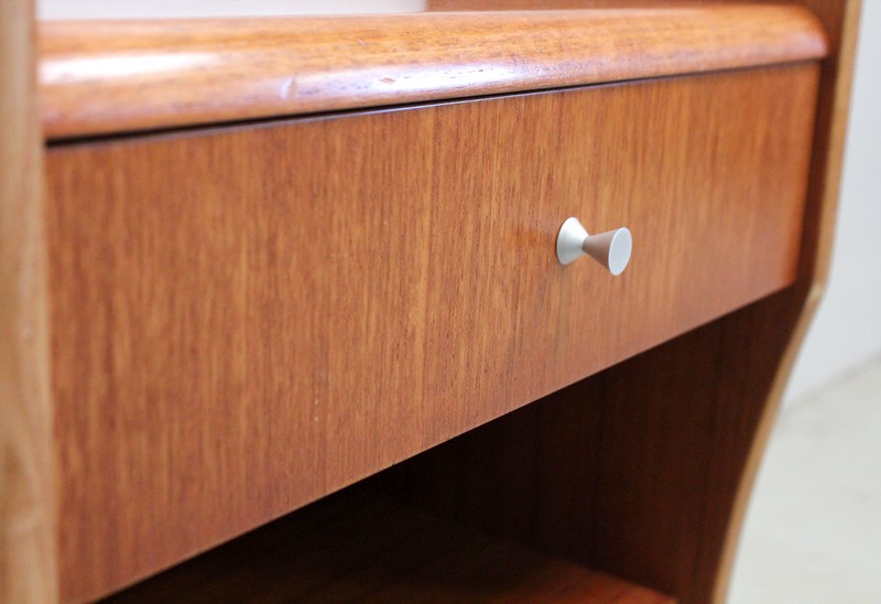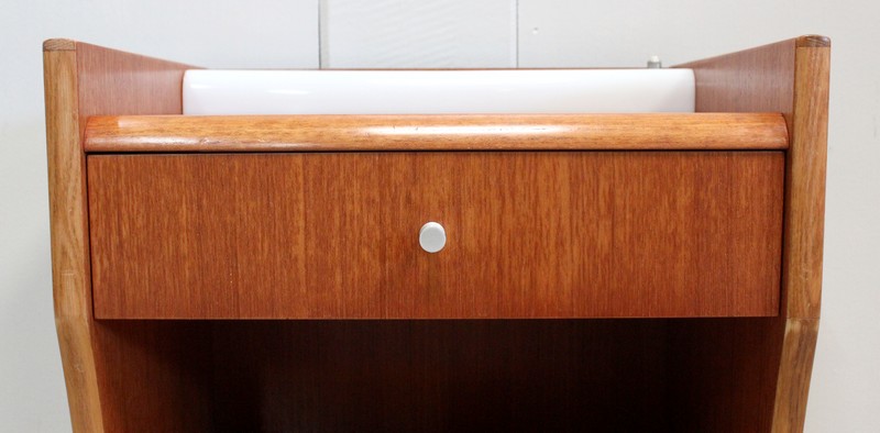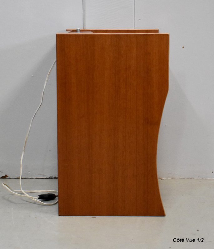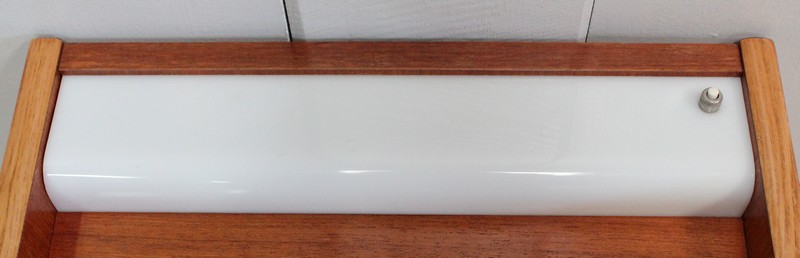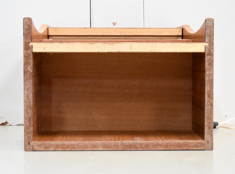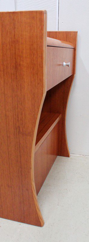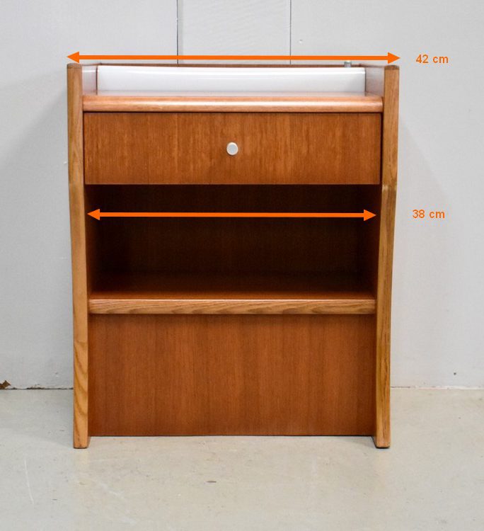 Ce Chevet en Teck des années 70 présente sur la partie arrière du Plateau un Système d’éclairage résolument Vintage avec son Cache de couleur blanche et son Bouton-poussoir pour la mise en lumière.