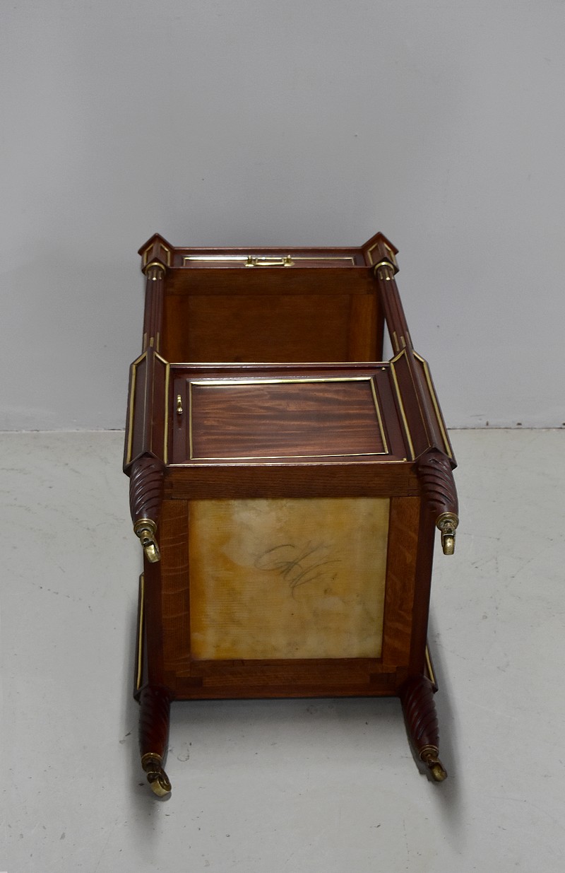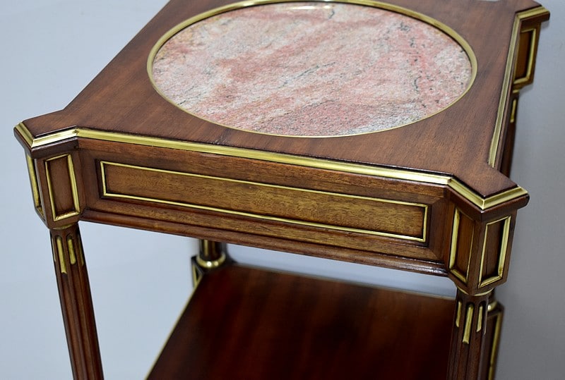 Élégante et originale petite table de chevet de style Louis XVI en Acajou massif et placage d’Acajou, panneautée et incrusté de laiton toutes faces.