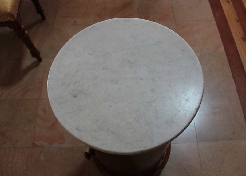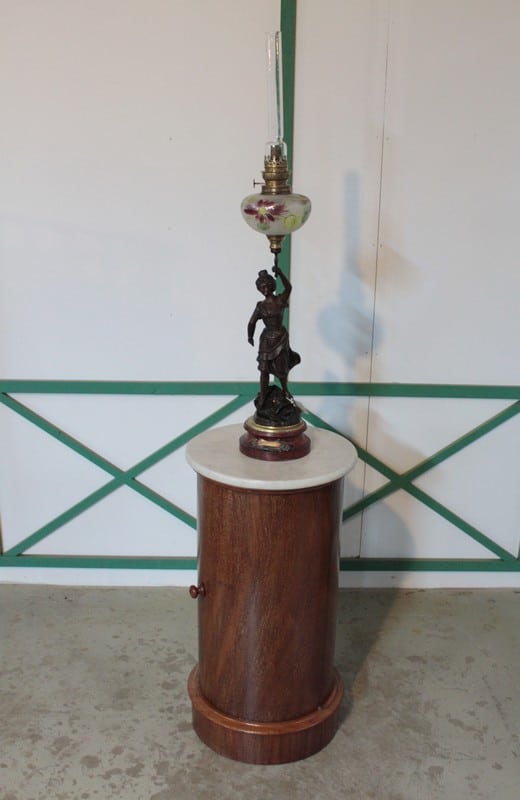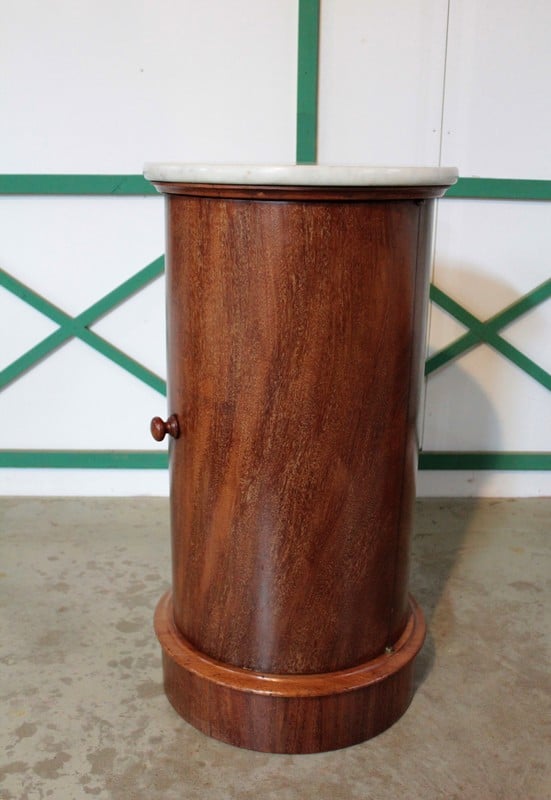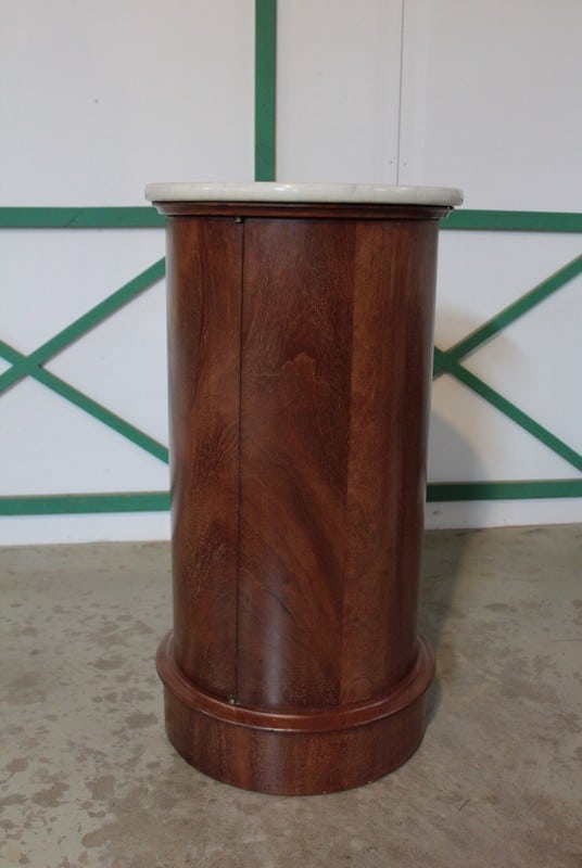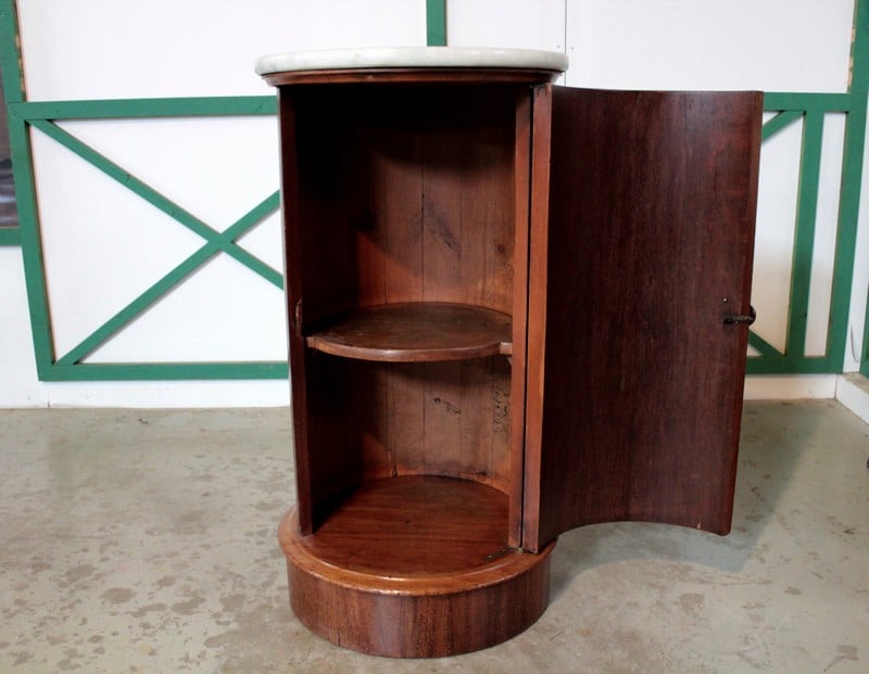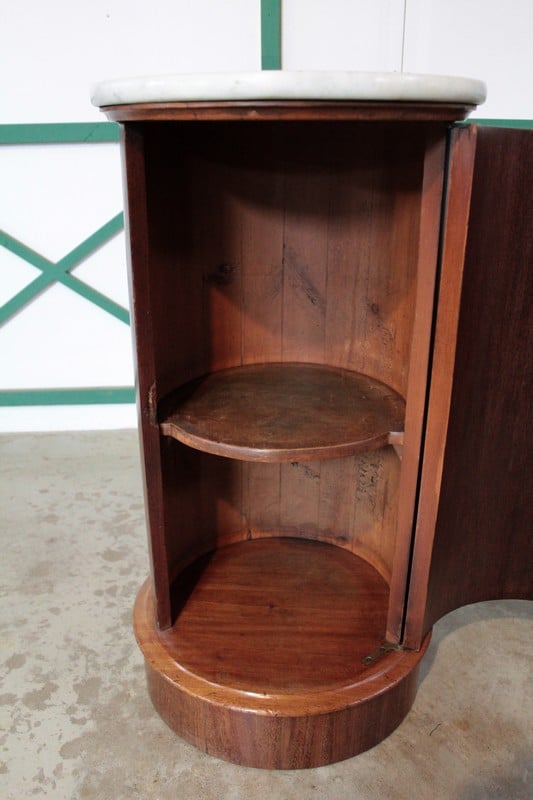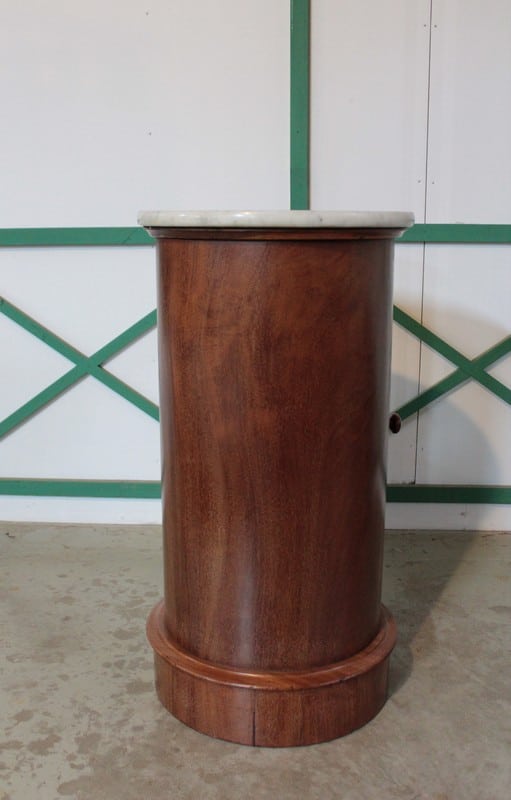 Somno en acajou blond d’origine anglaise ouvrant par une porte. A l’intérieur 1 étagère. Le dessus est en marbre blanc. Époque XIXe