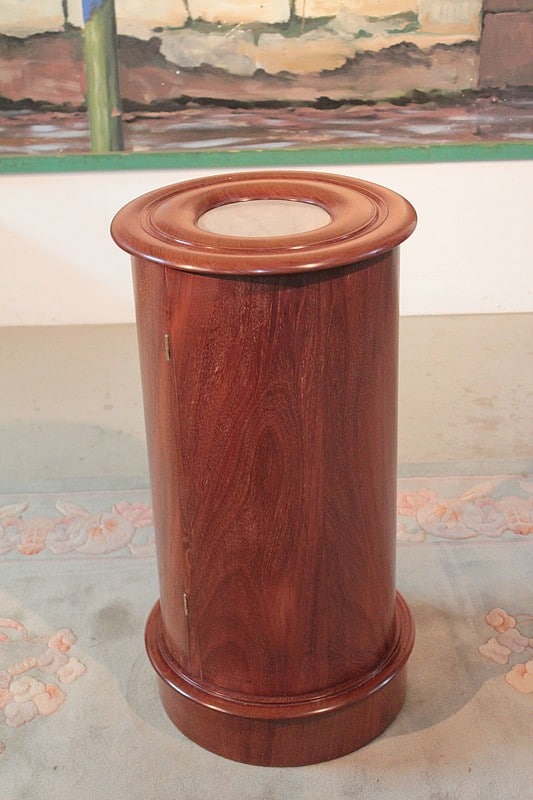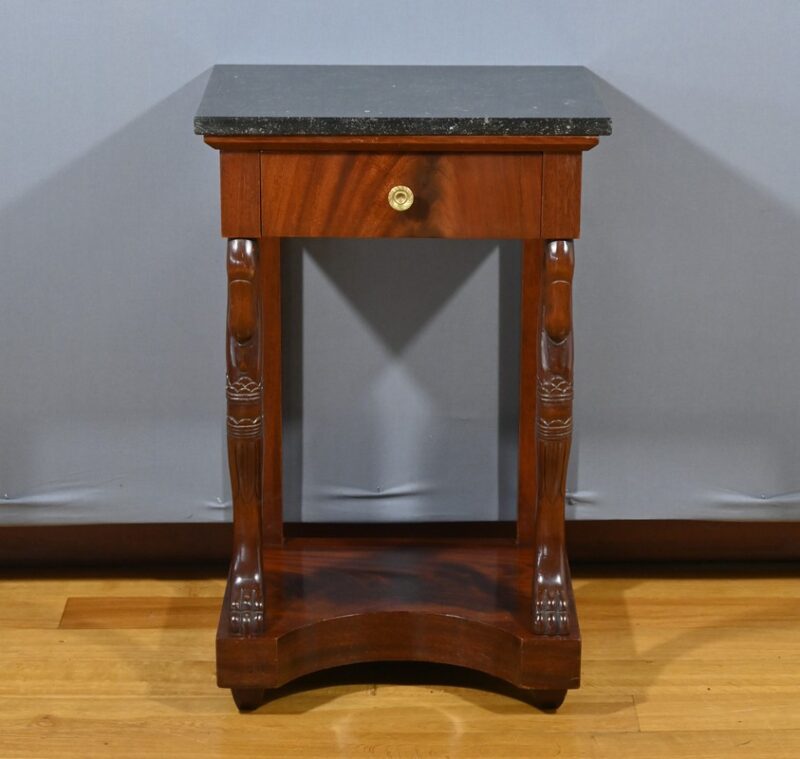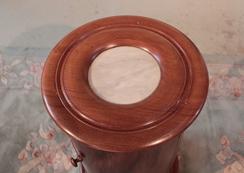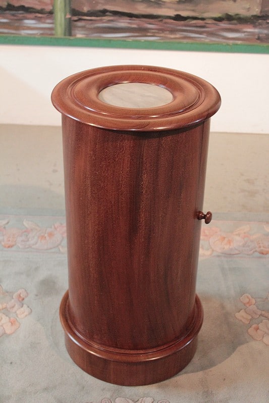 Somno en acajou et placage d’acajou ouvrant par une porte. Dessus en marbre blanc serti dans une couronne moulurée en acajou. Intérieur garni d’une étagère.