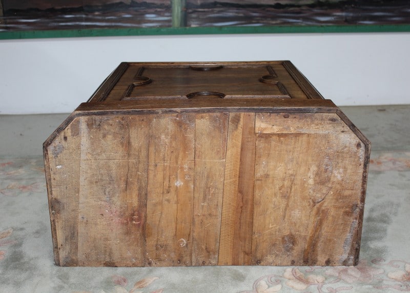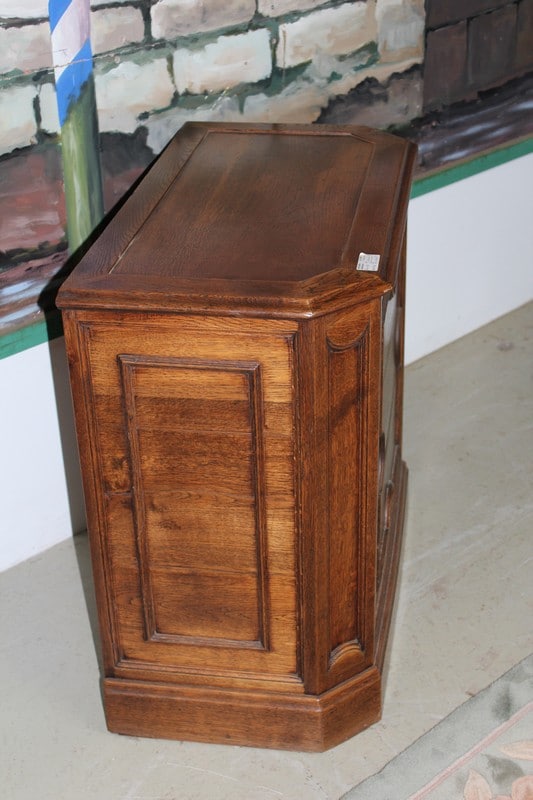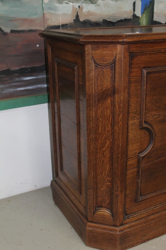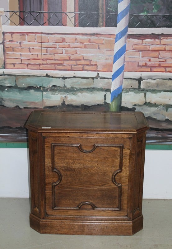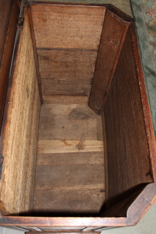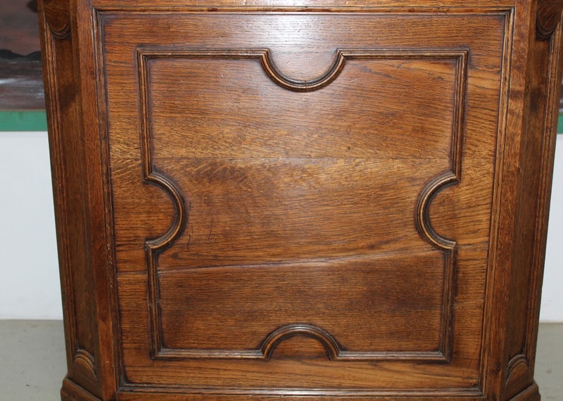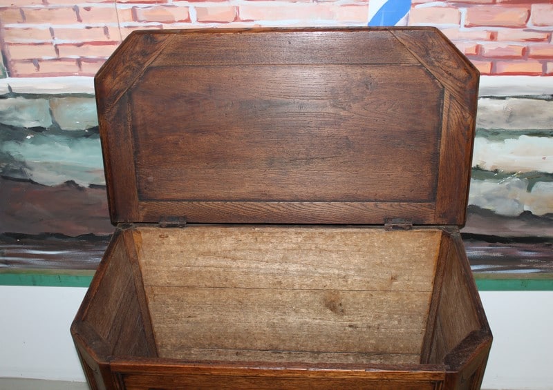 Coffre à linge en chêne à pans coupés. Il repose sur plinthe. Moulurations sur les panneaux de la façade et des côtés.