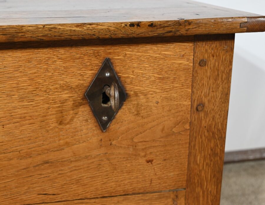 Ce coffre proposé par notre galerie n’en fait pas exception. Il est équipé de trois serrures fonctionnelles avec entrées en fer forgé et trois clés, le tout étant authentique.