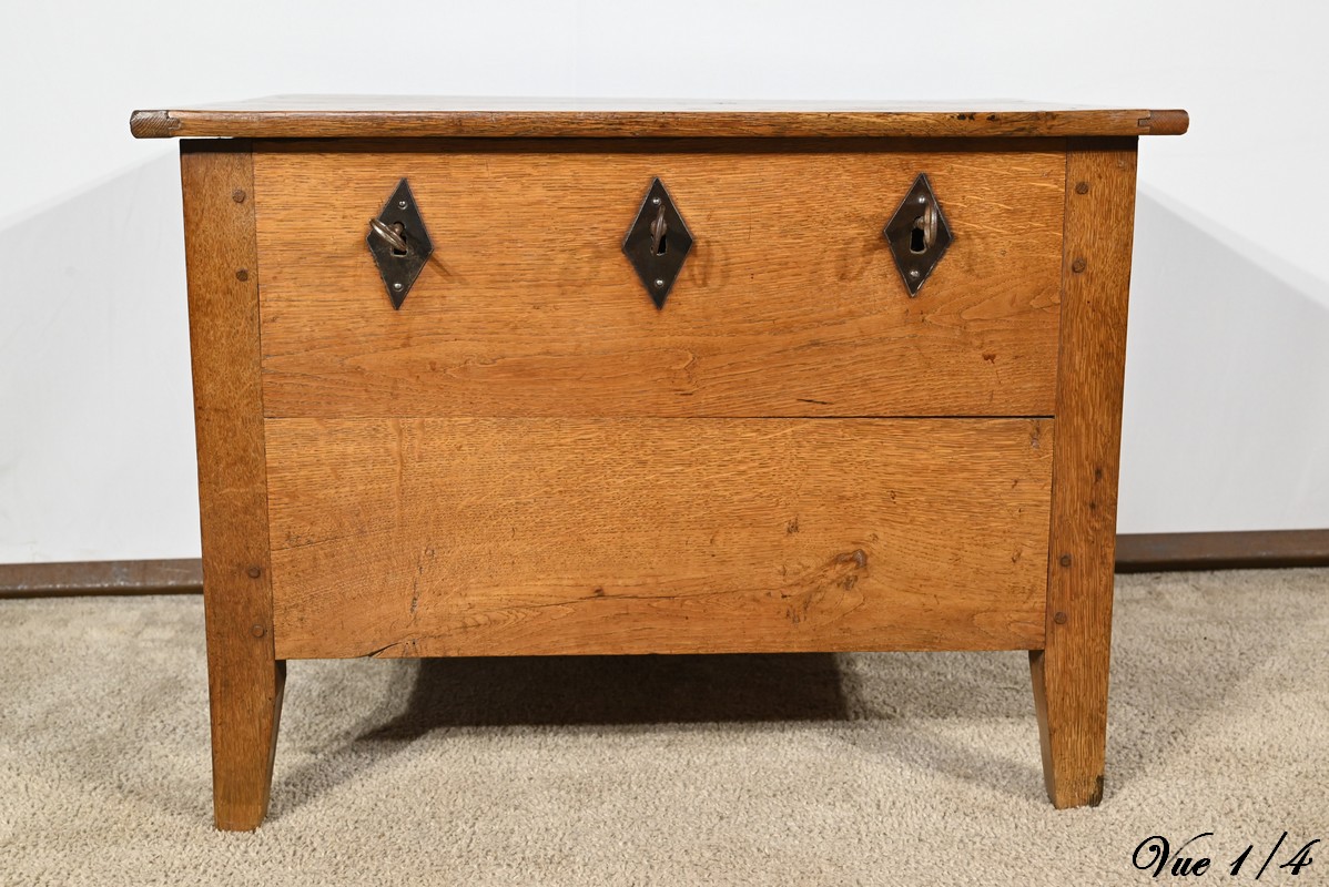 Ce coffre de communauté en chêne massif présente un couvercle monté sur charnières en fer et maintenu ouvert par un compas dit à genou.
