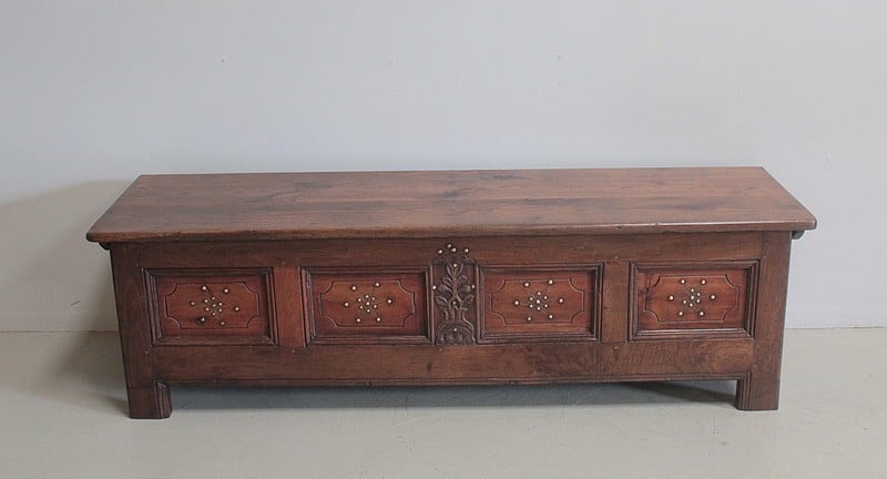 Façade à 4 panneaux à décor d’étoiles soulignées de clous de cuivre. Une sculpture de branchages orne le milieu.