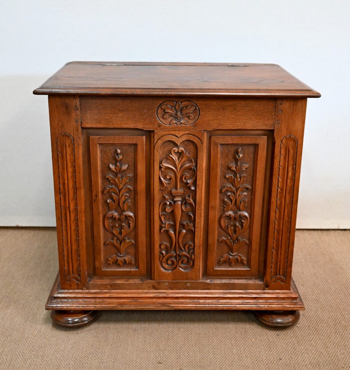 Ce petit coffre en chêne massif goût Renaissance possède une façade à deux panneaux latéraux, ornés de plates-bandes, et dont les motifs centraux, sculptés, sont des fleurs et feuillages. Au milieu, on retrouve cette même inspiration, encadrée par des volutes.