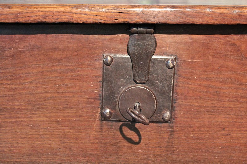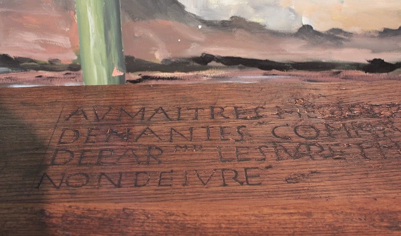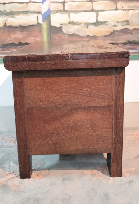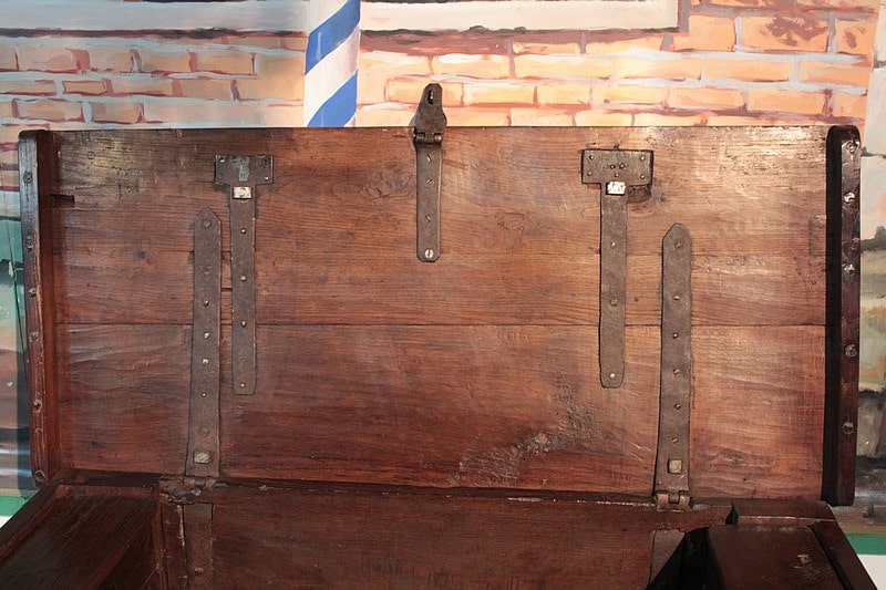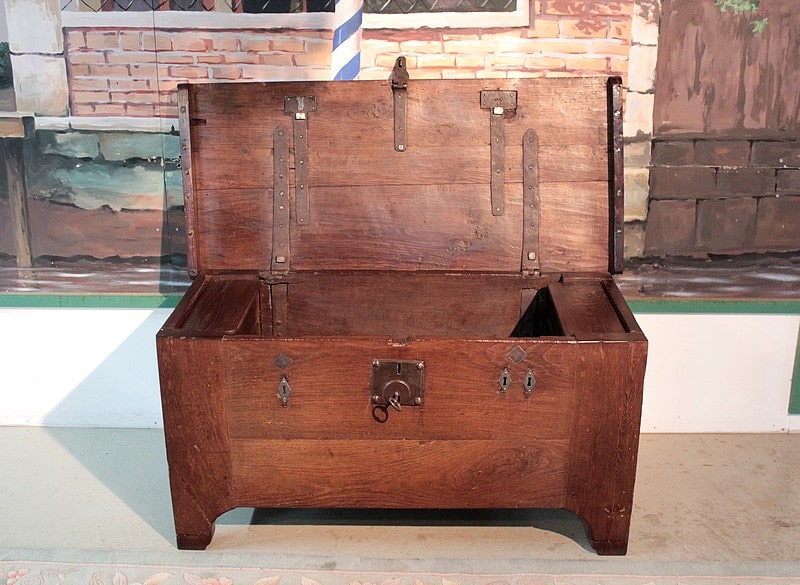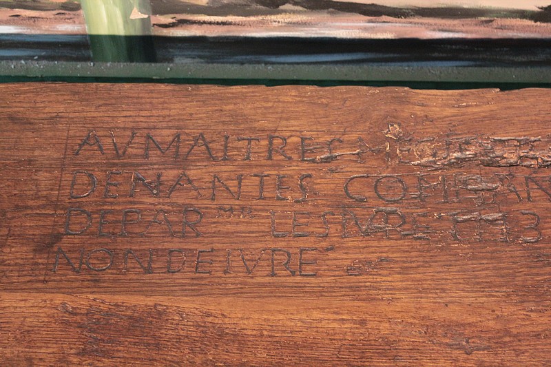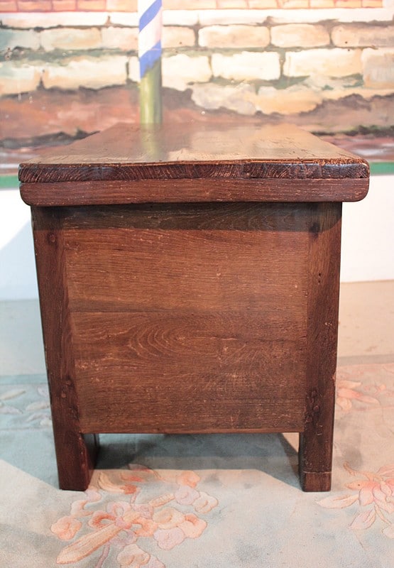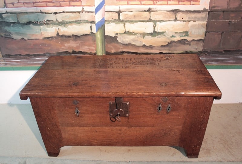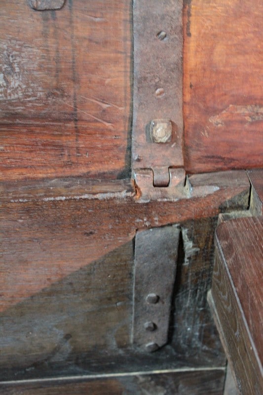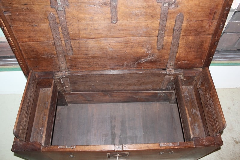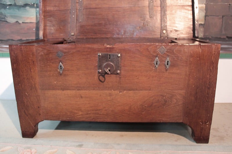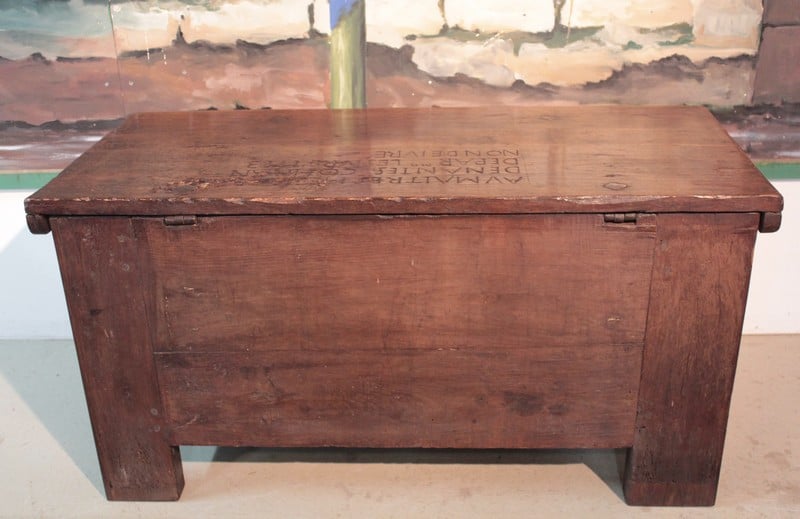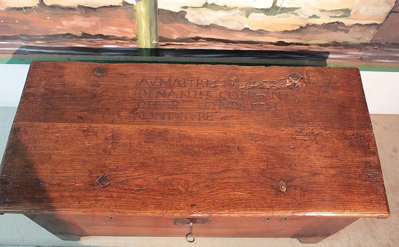 Coffre en chêne fermant à clé avec serrure d’origine. Le dessus est renforcé par de larges ferrures à l’intérieur. Il est gravé en vieux français ‘AU MAITRE ……..DE NANTES PAR Mr ………………………….