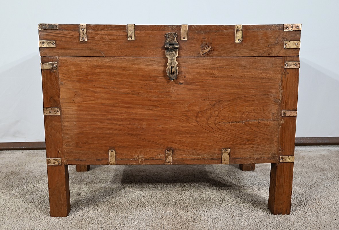 Cette malle montée sur quatre pieds, entièrement en teck massif se caractérise par ses nombreuses lanières cloutées en laiton affirmant son caractère. Ces dernières relient solidement toutes les faces du coffre. A l’ouverture, nous découvrons un grand espace de rangement avec un casier latéral. Son transport est rendu possible par la présence sur les côtés de poignées tombantes en fer. Un objet charismatique et authentique.