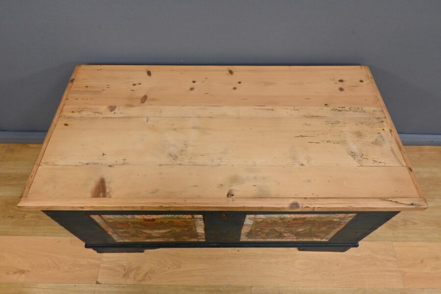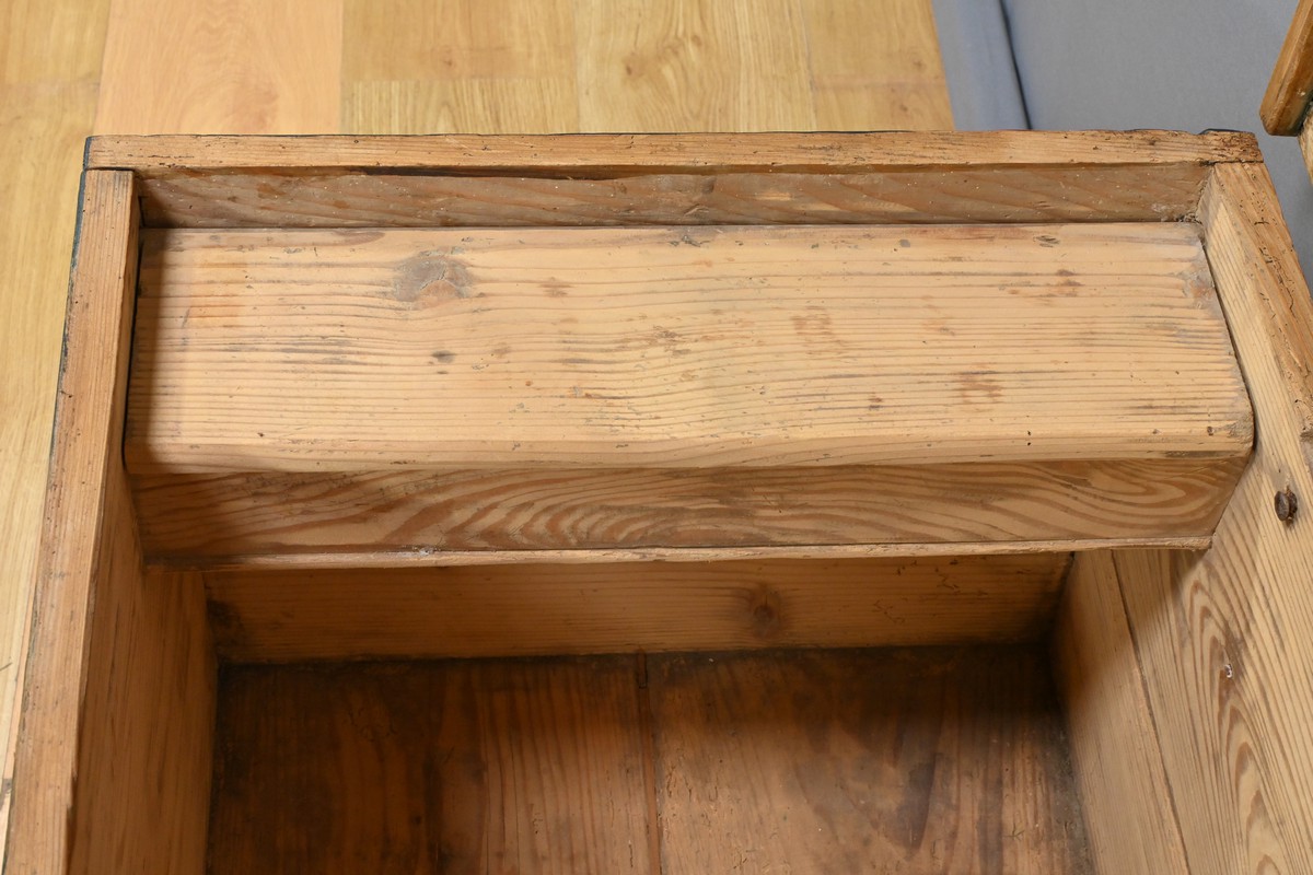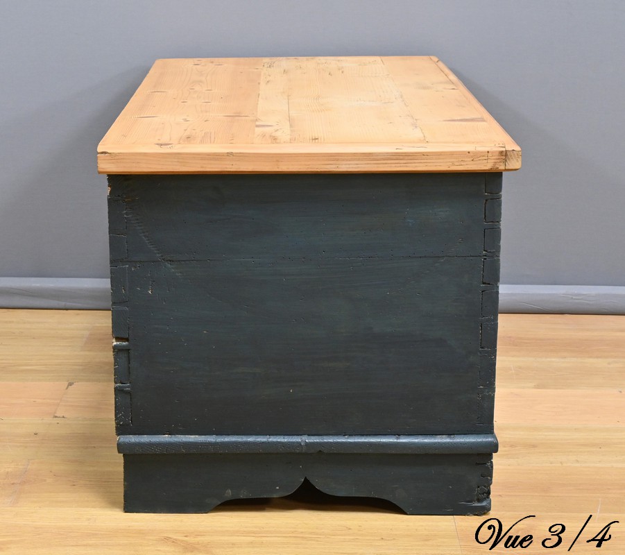 Ce coffre en pin, d’origine des pays de l’Est et datant de la fin du XIXe siècle, est une pièce unique qui combine charme rustique et fonctionnalité.