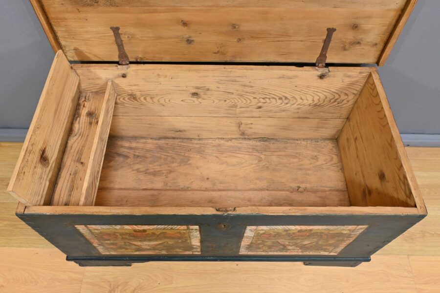 Peint sur fond bleu, ce coffre est décoré de motifs polychromes de fleurs stylisées, témoignant du savoir-faire artisanal de l’époque.