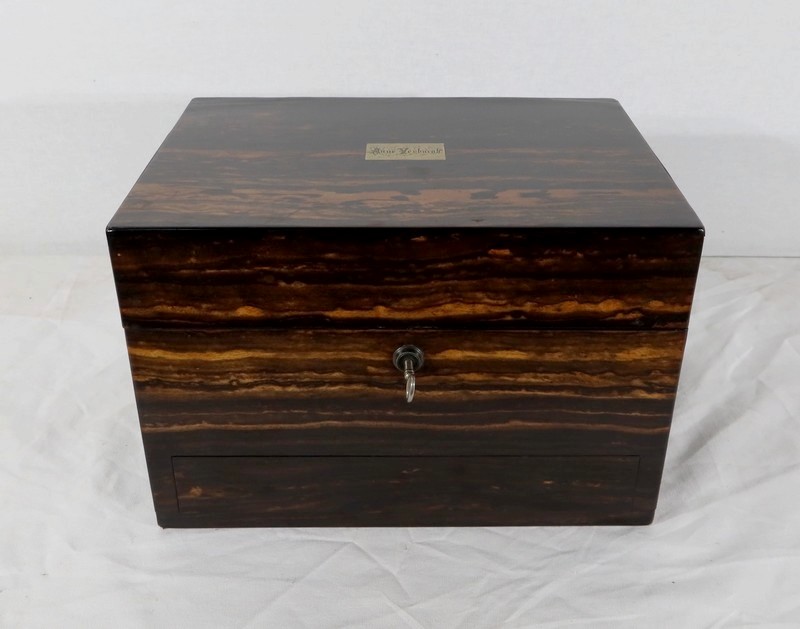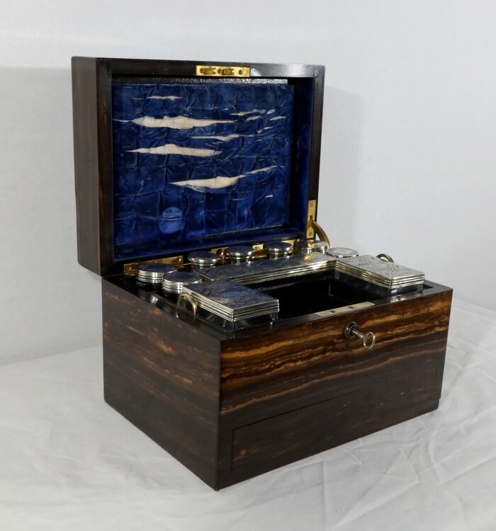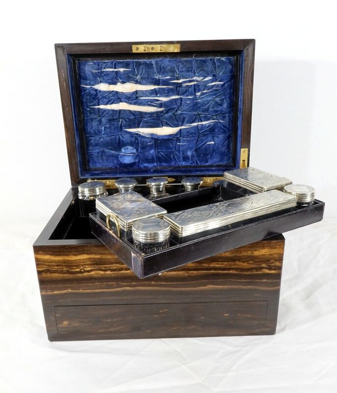 Magnifique coffret de toilette d’époque victorienne, réalisé en placage de Bois de Serpent sur Acajou : ce bois précieux d’un jaune profond, endémique de la forêt guyanaise, tire son nom des grandes tâches brunes qui viennent le nuancer, rappelant les écailles d’un serpent.