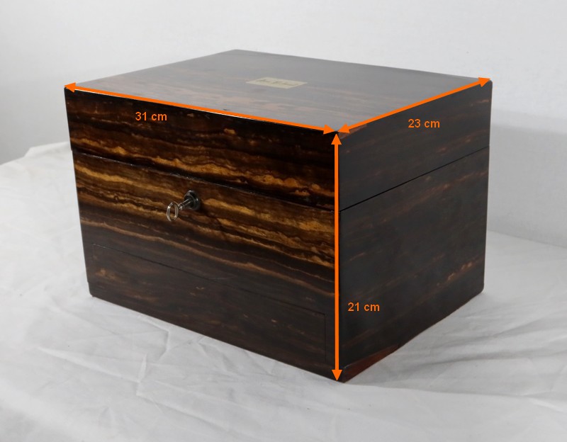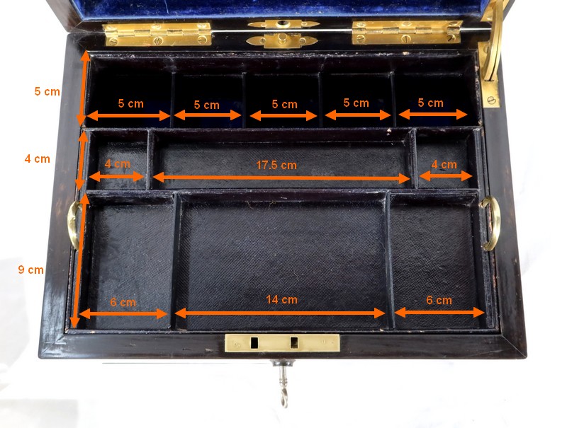 Le couvercle, revêtu de son tissu bleu roi d’origine, reste bloqué grâce à un système de compas à pince, ajustable à souhait en quatre positions. Un discret bouton poussoir permet l’ouverture d’un tiroir arborant le même tissu, qui offre une cache idéale pour dissimuler des bijoux aux regards indiscrets. Cet ouvrant présente la signature de la célèbre manufacture de Liverpool, « John Bagshaw & Sons », fournisseur de la noblesse britannique à l’ère victorienne, attestant de sa qualité et de son authenticité. À noter la présence sur le couvercle d’une plaque portant le nom de la première propriétaire, Anne Verburgh.