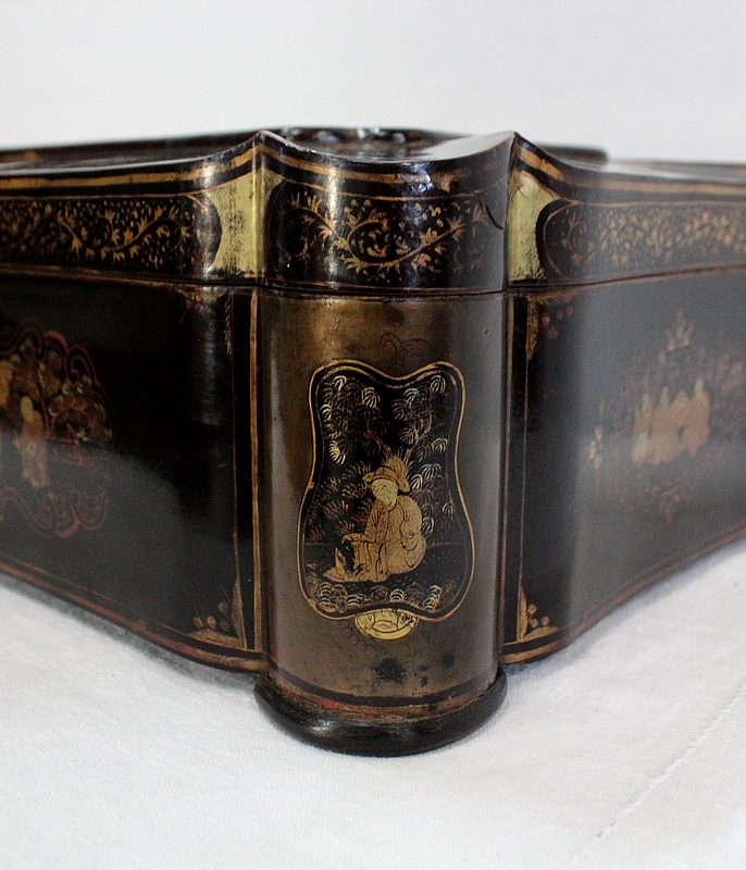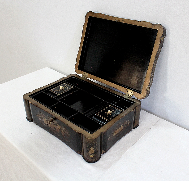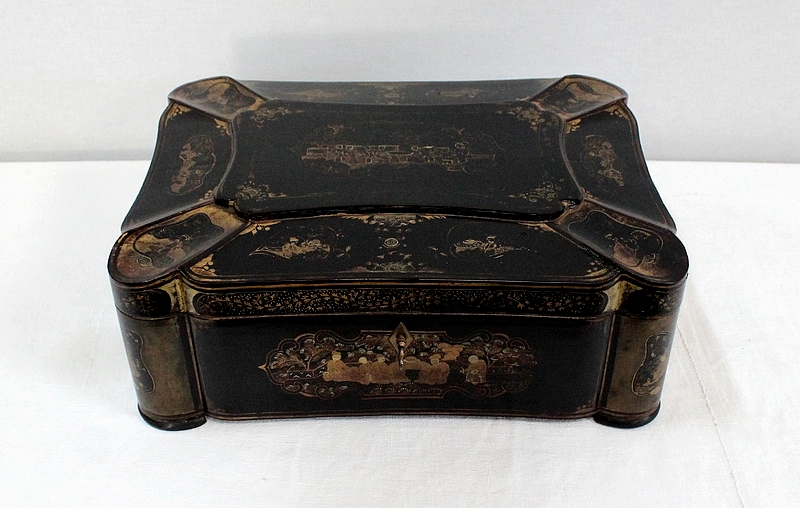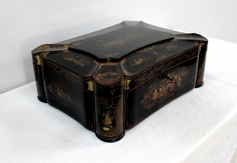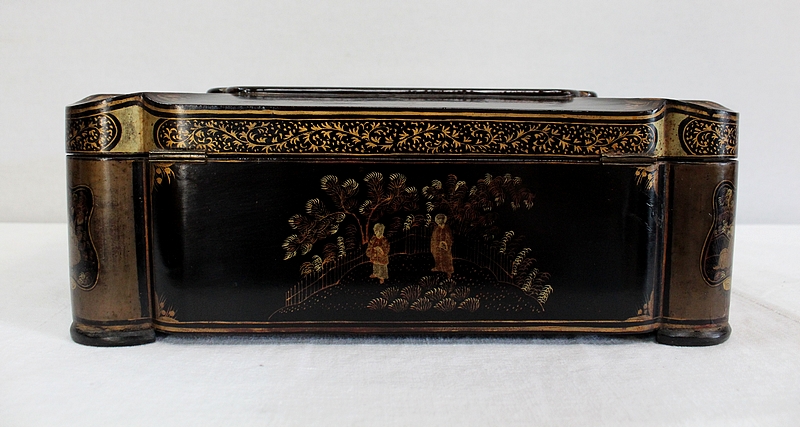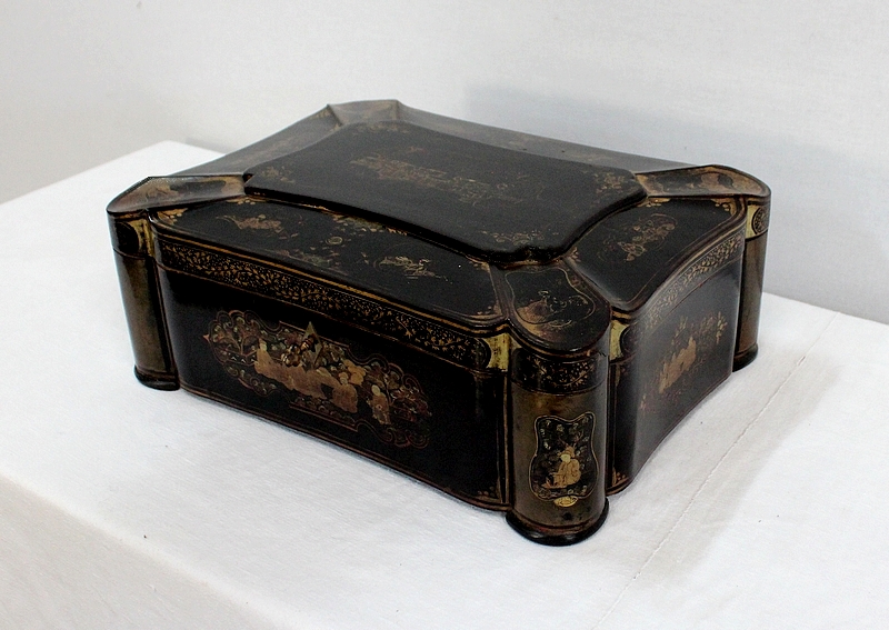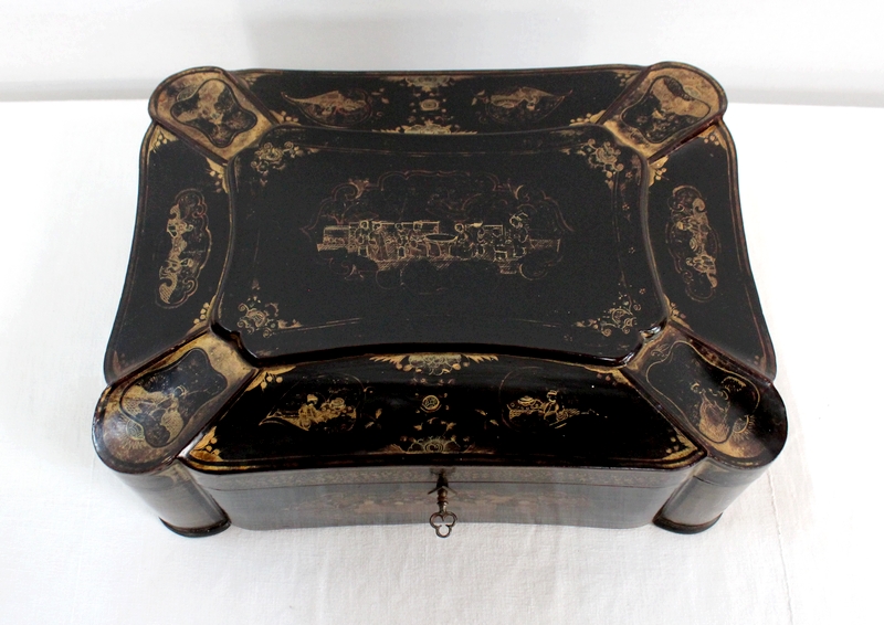 Coffret en laque noire à décors dorés japonisant présentant des formes galbées et quatre angles proéminents.
