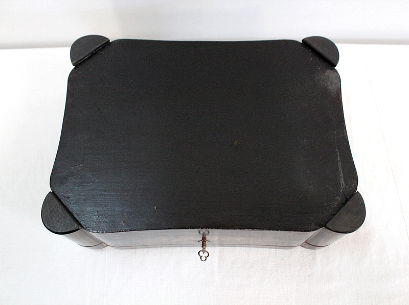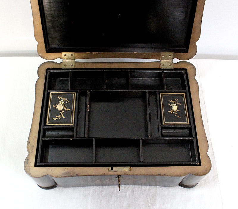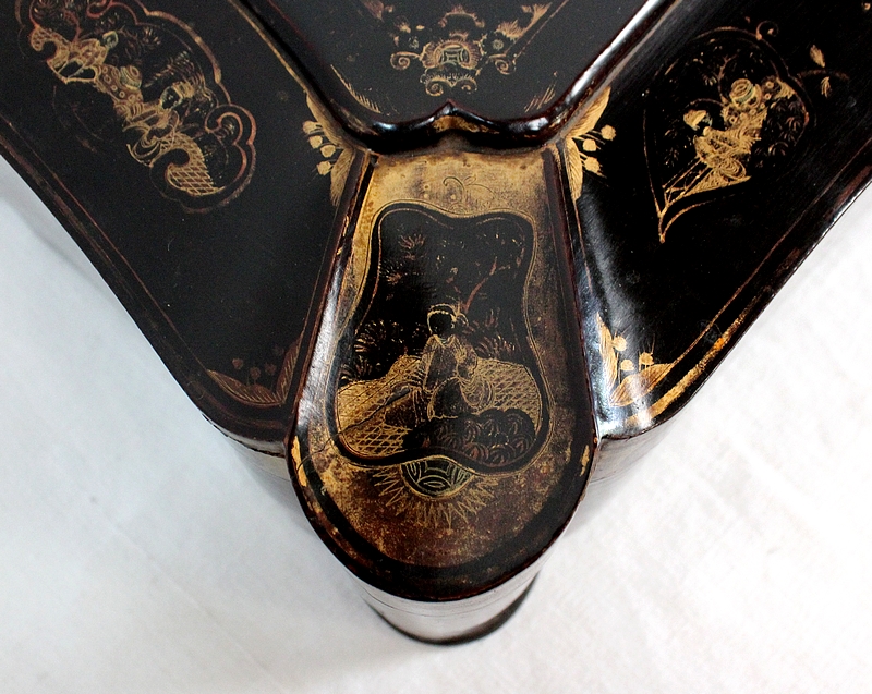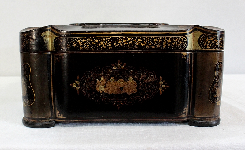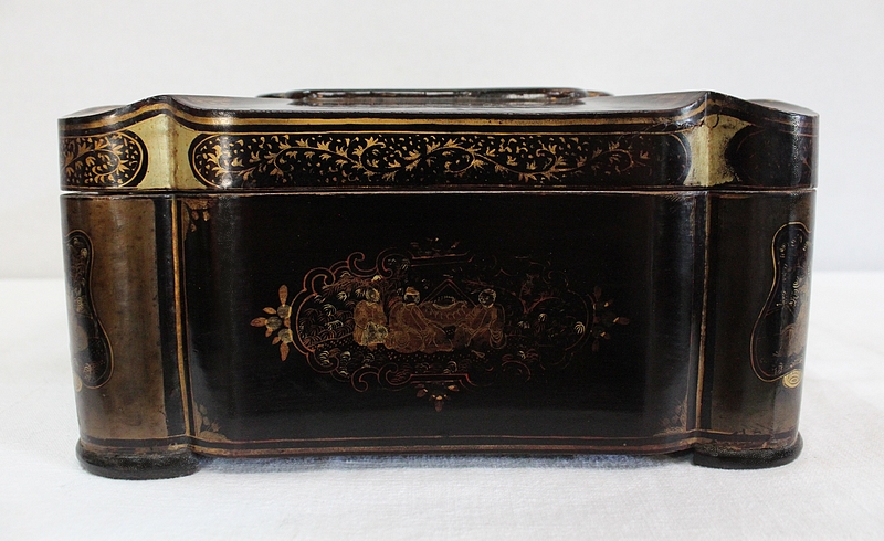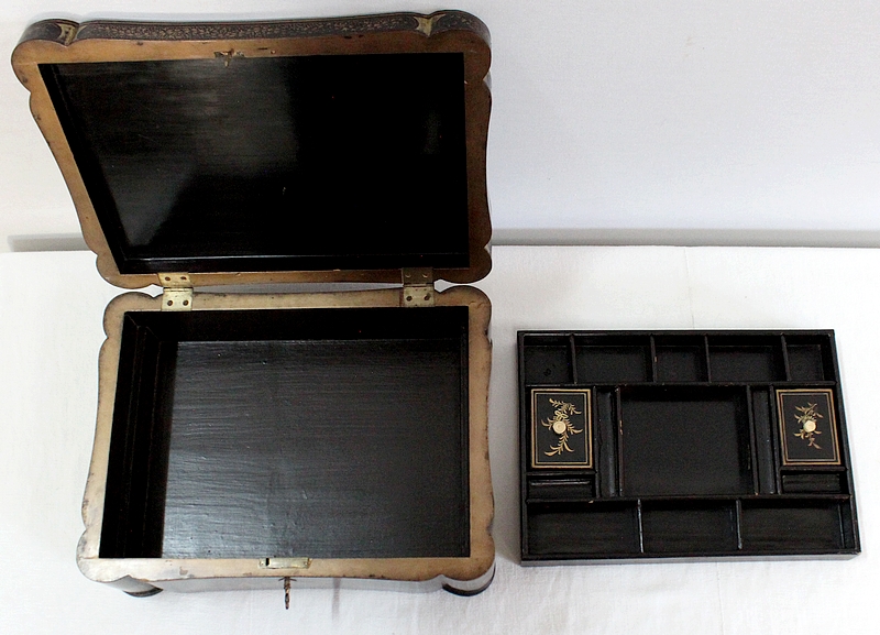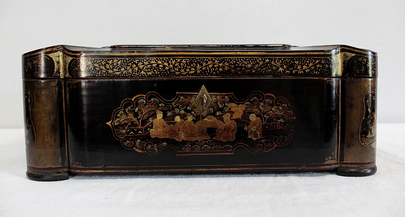 Coffret en laque noire à décors dorés japonisant présentant des formes galbées et quatre angles proéminents.