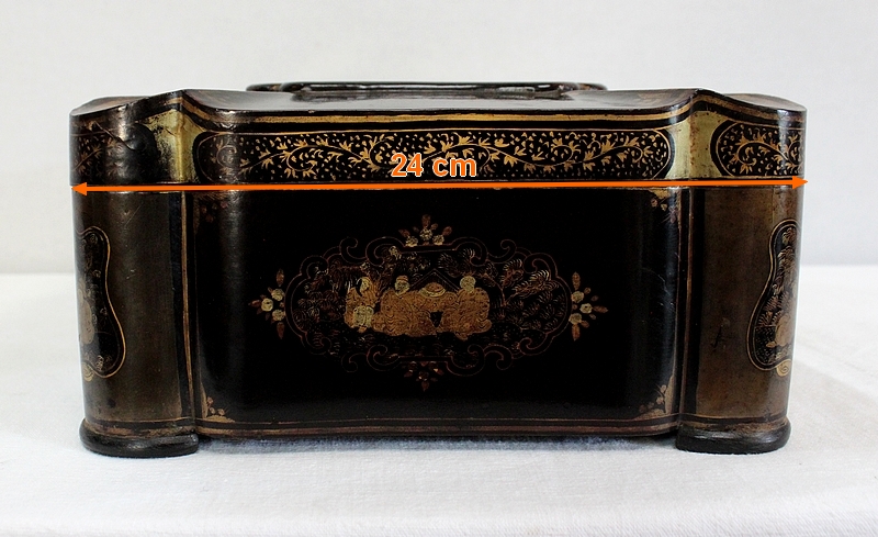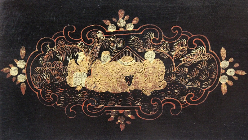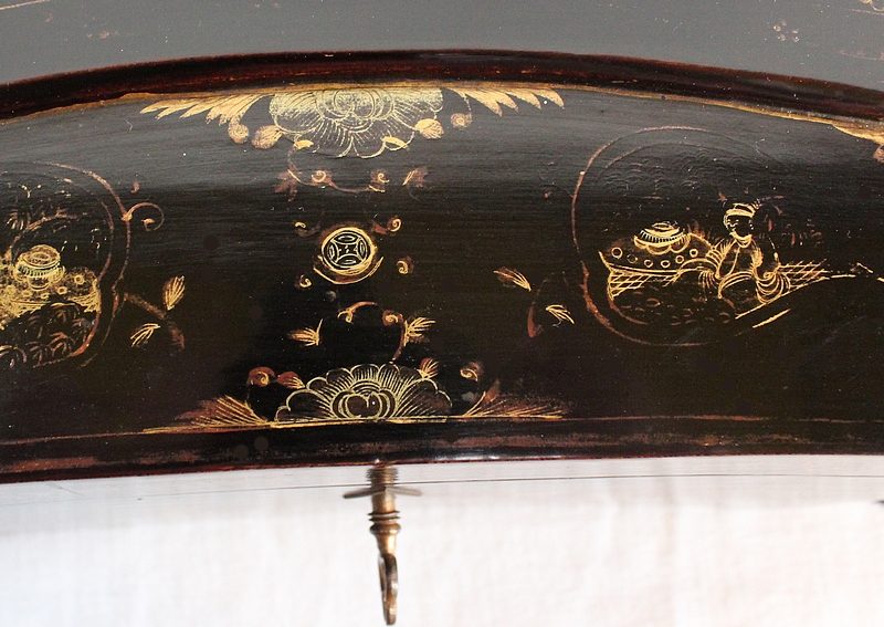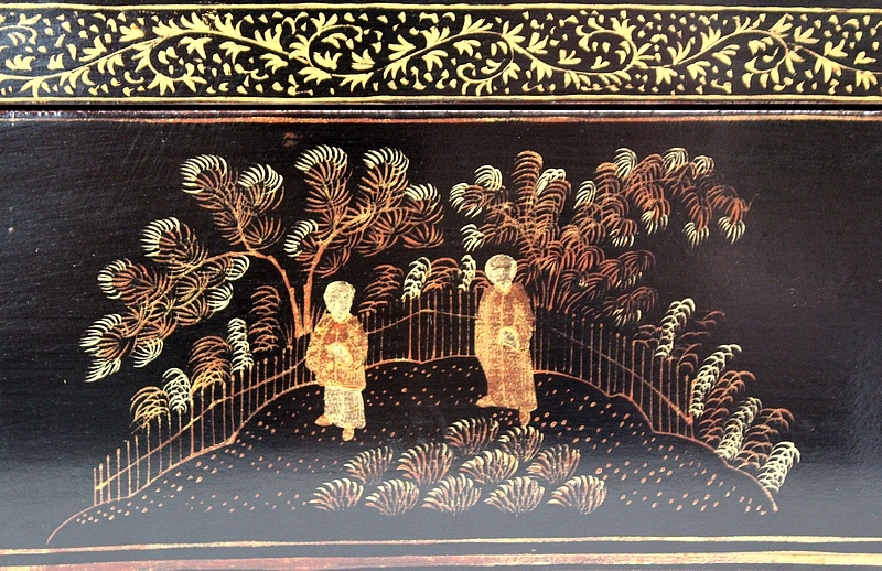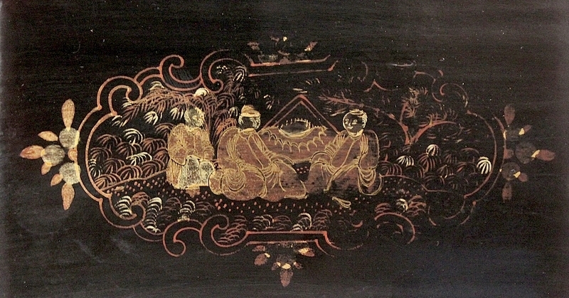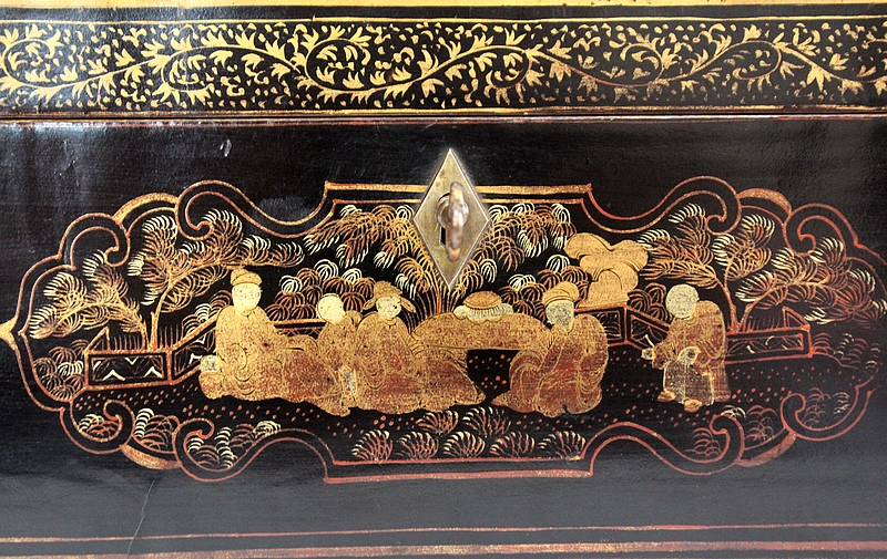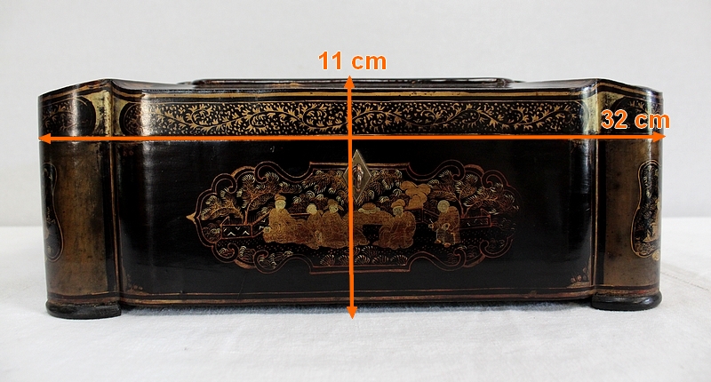 Ce petit coffre ouvre par un couvercle à relief, avec angles à ressauts. Ces coins s’embellissent de fins décors polychromes, représentant des scènes collectives traditionnelles d’Asie. En son centre, l’ouvrant s’agrémente d’un dessin partiellement effacé avec le temps n’ôtant en rien le charme de l’objet.