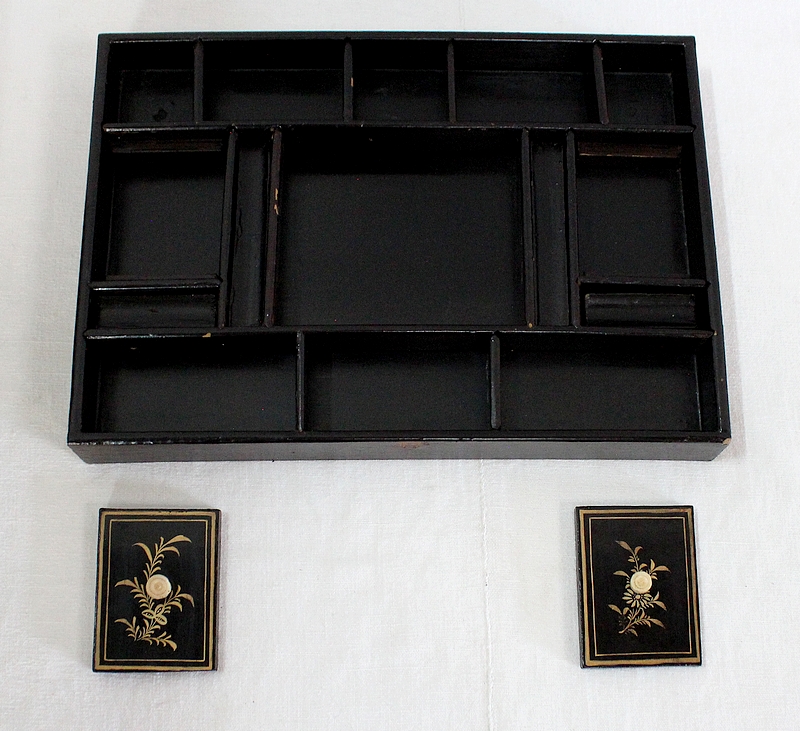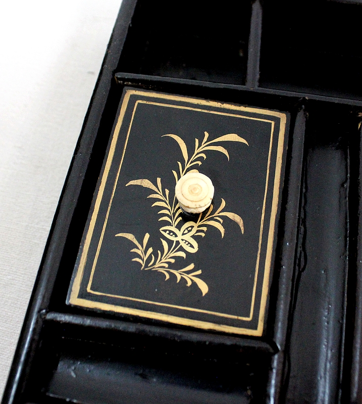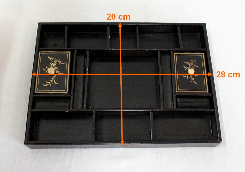 Une fois ouvert, ce coffret révèle un compartiment de rangements composé de casiers de différentes tailles et de deux petits couvercles aux arabesques dorées.