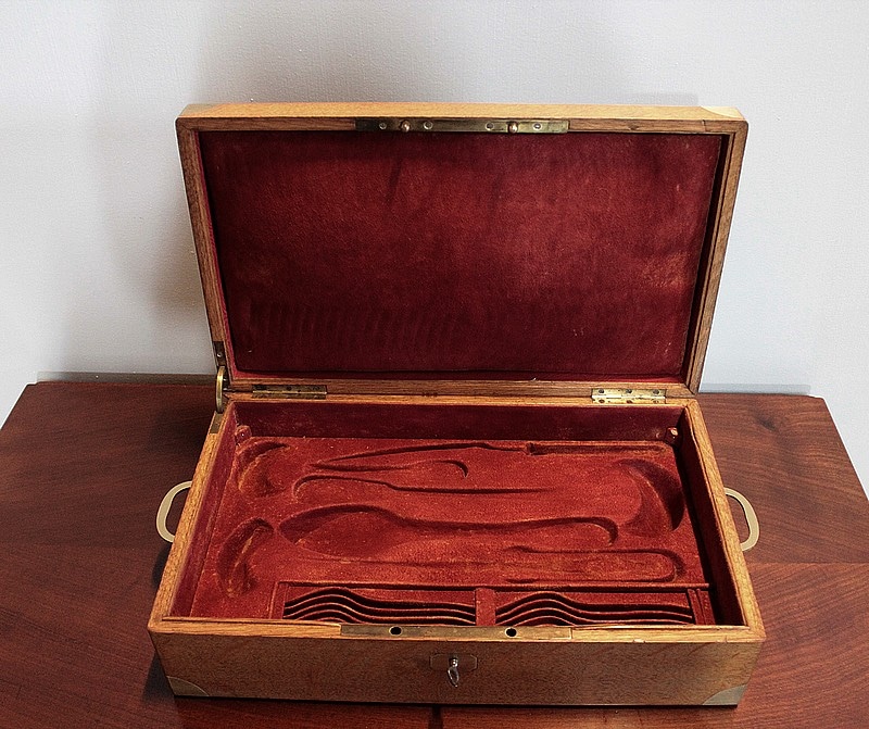 Intérieur en tissu couleur prune destiné à recevoir des pièces d’orfèvrerie (louches, couteau, petites fourchettes..).