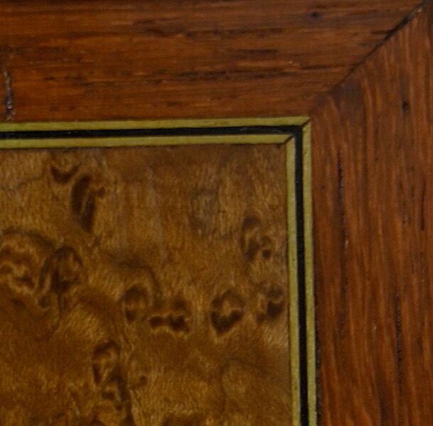 Le dessus en placage de noyer sur quatre feuilles est entouré d’un filet de bois teinté vert, suivi d’un encadrement en palissandre, puis de frises décoratives, de loupe de thuya et enfin d’acajou.