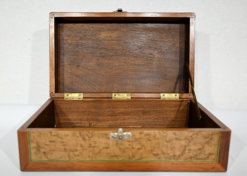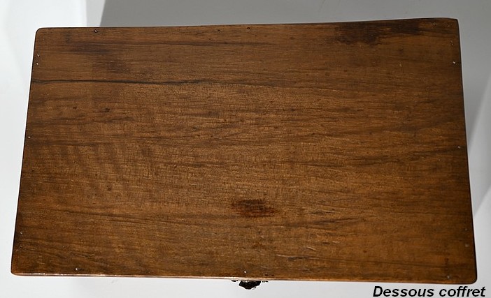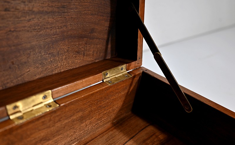 Le couvercle monté sur trois charnières est pourvu d’un compas à genoux maintenant son ouverture, et possède un fermoir métallique en parfait état de fonctionnement.