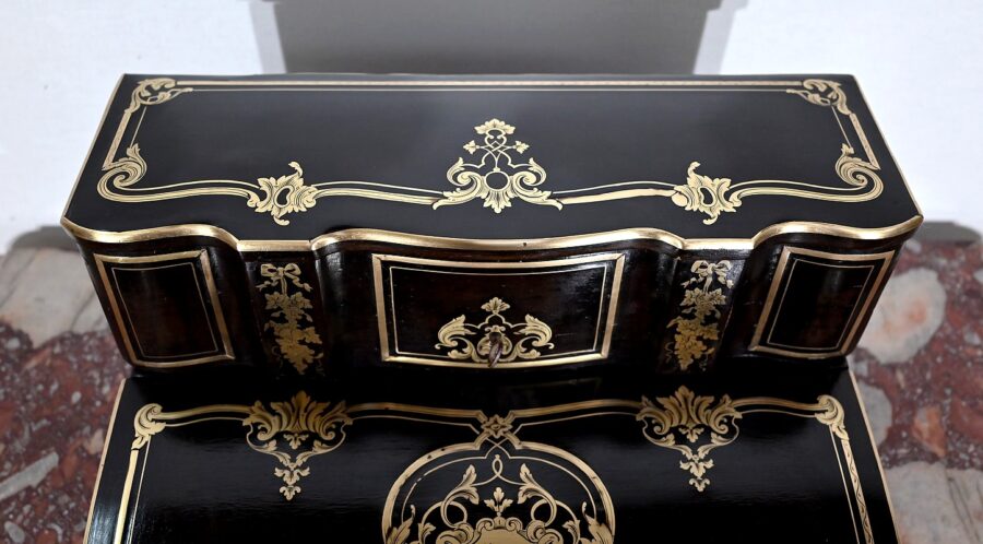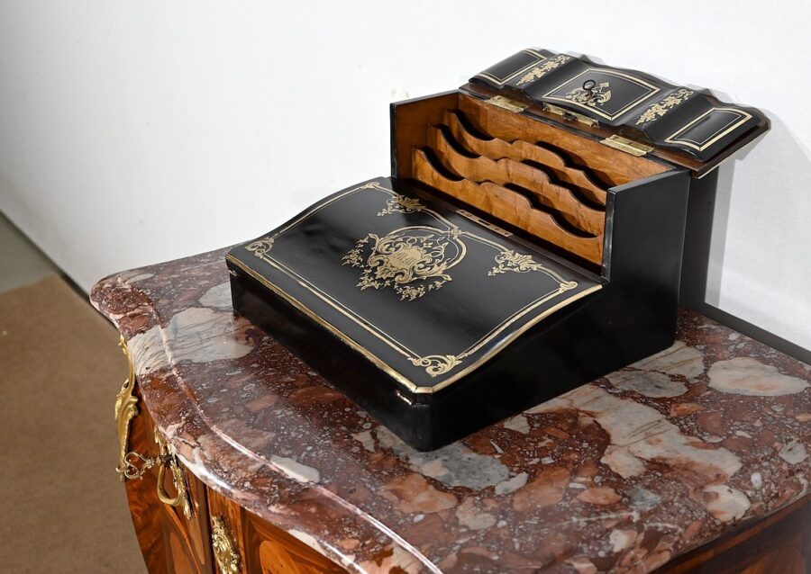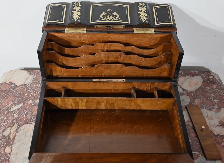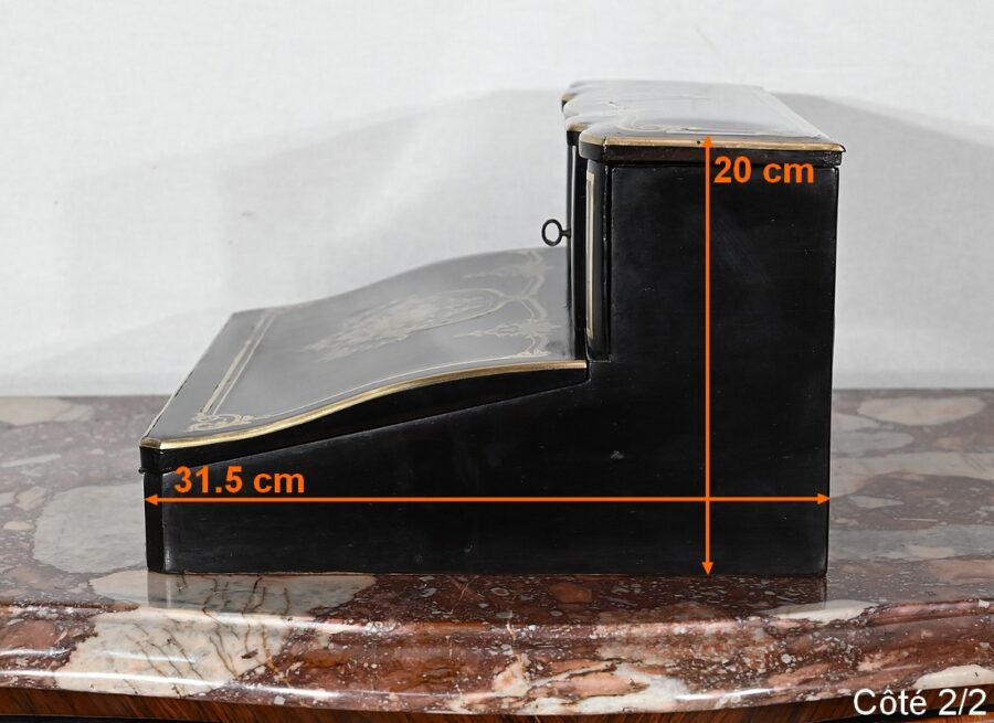 Outre l’aspect fonctionnel, vous apprécierez les ornementations riches de cet écritoire Napoléon III. Un bel objet qui attire les regards et attise la curiosité.