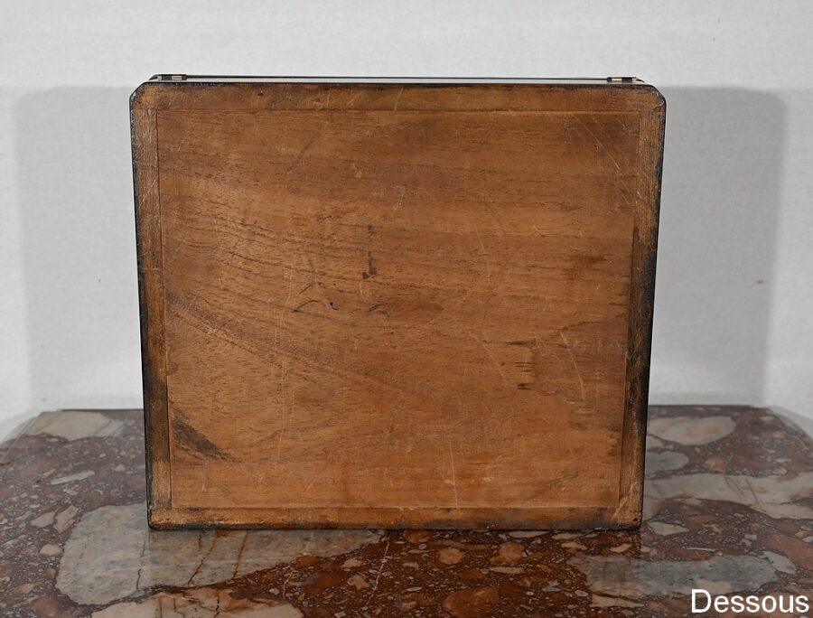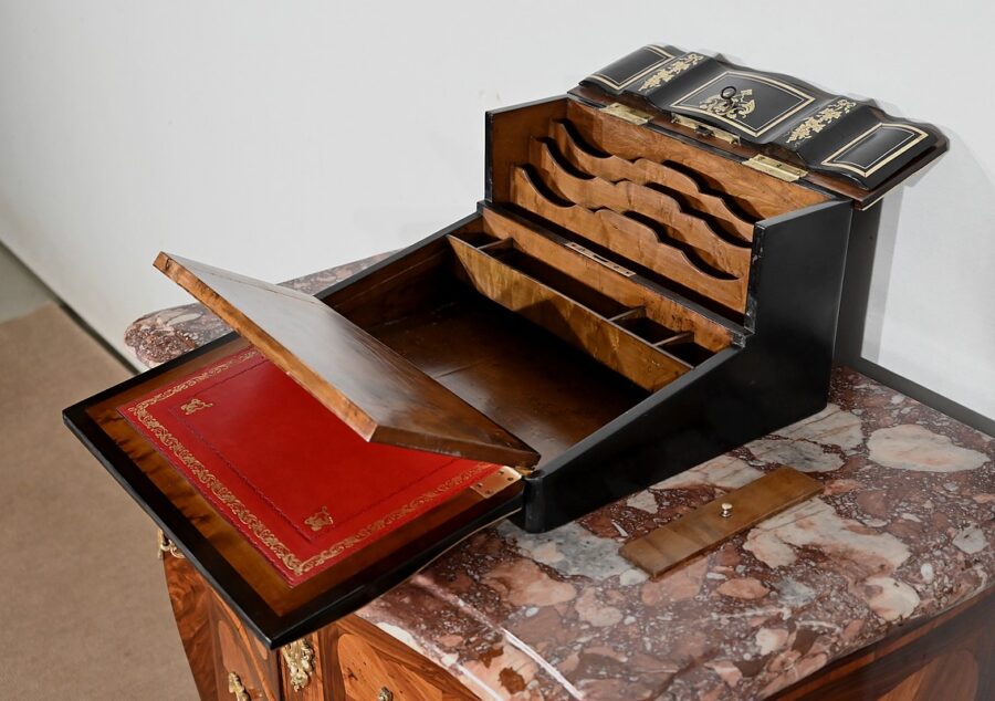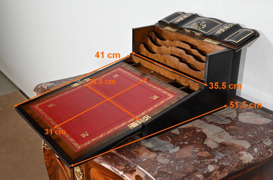 L’intérieur, en moucheté de Thuya, est constitué de petits espaces de rangement et d’un cuir à vignette dorée neuf, complété d’une petite languette. Celle-ci se tire pour découvrir un espace de rangement en dessous.