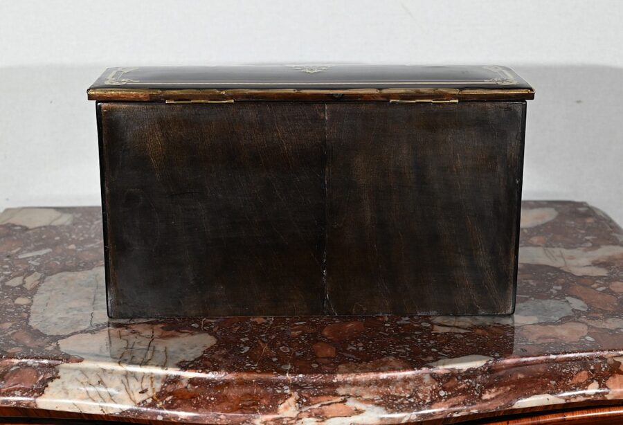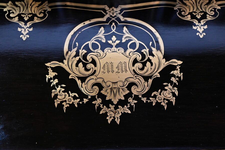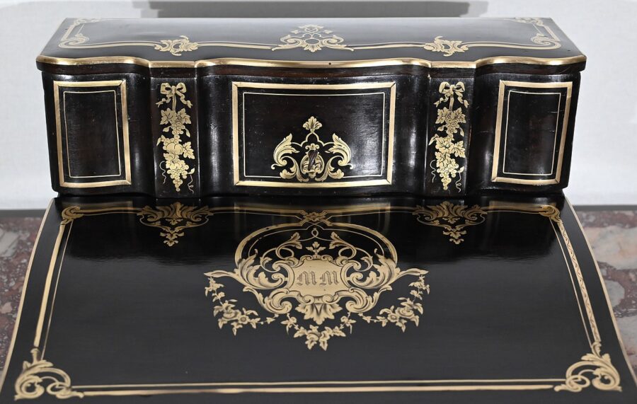 Rare écritoire de voyage, en bois noirci avec incrustations de laiton figurant un monogramme au centre, entouré de fleurs, de volutes, d’arabesques et de nœuds.
