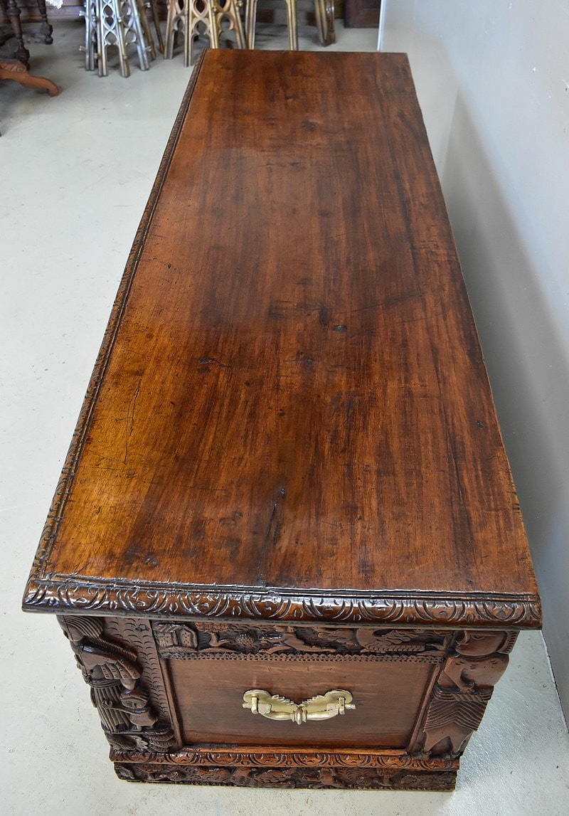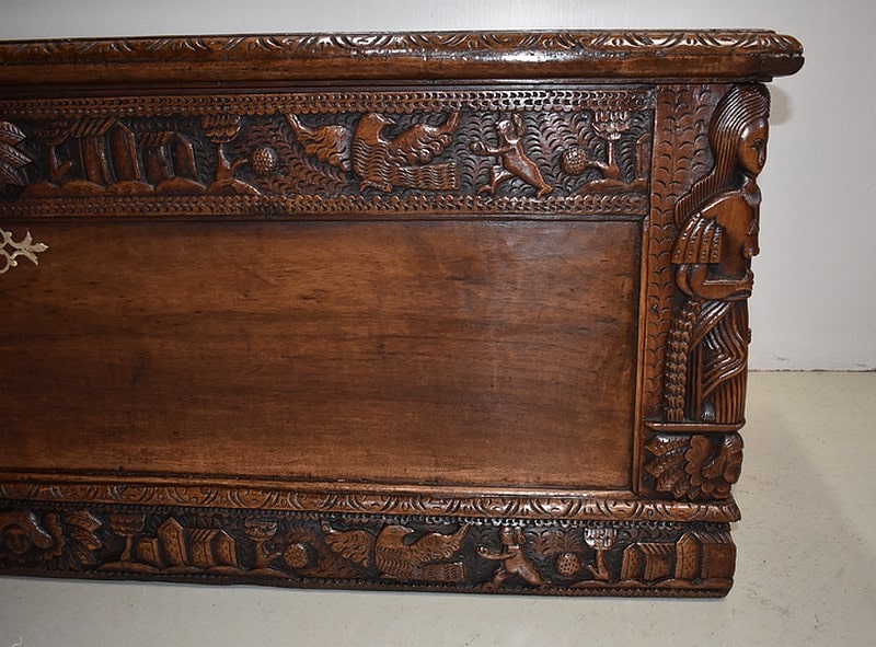Grand coffre en noyer massif – dessus, façade et côtés – orné de nombreuses sculptures symboliques. Les quatre angles sont ornés de personnages représentant les continents de l’Asie et de l’Afrique , egyptiens, nippon et africain . Le dessus est entouré d’une moulure sculptée.