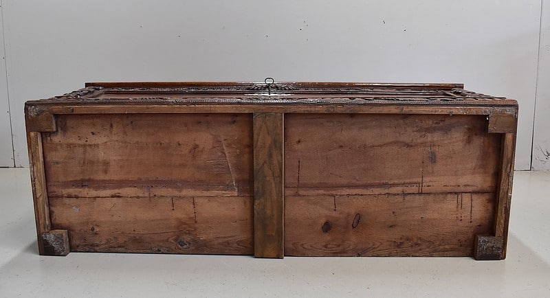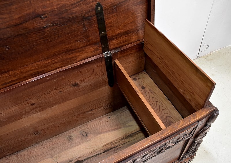 Le dessus se relève découvrant un coffret à l’intérieur. Il est maintenu ouvert grâce à un compas (rajouté). Il ferme à clé.