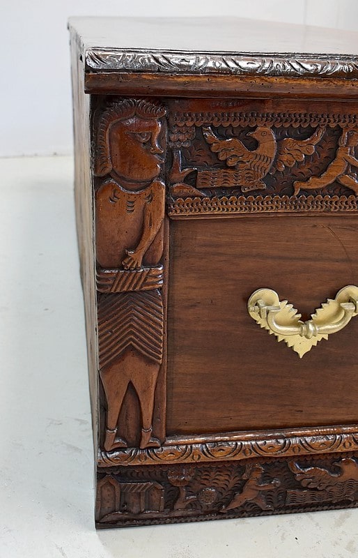 Les parties haute et basse du coffre sont sculptées d’une frise mettant en scène des aigles, des enfants, des maisons et des arbres, comme une allégorie à la vie.