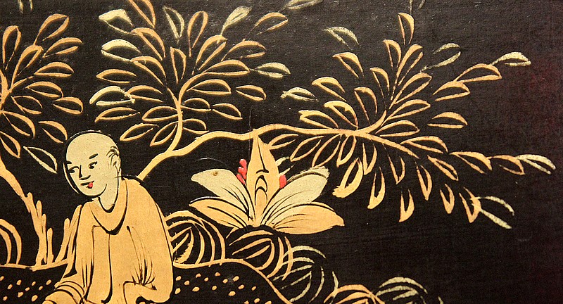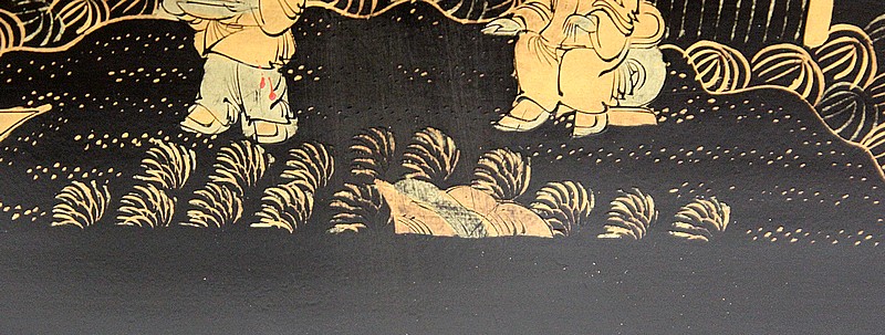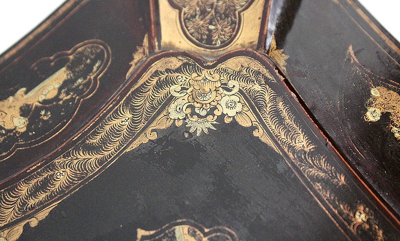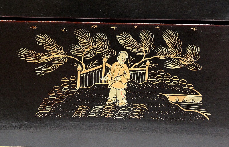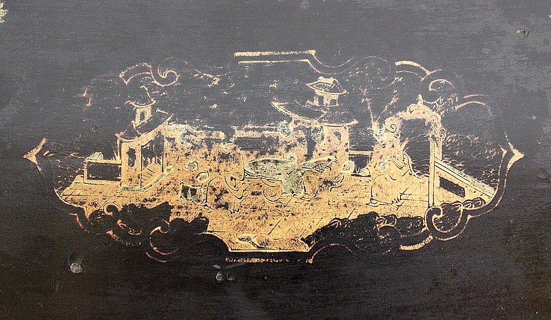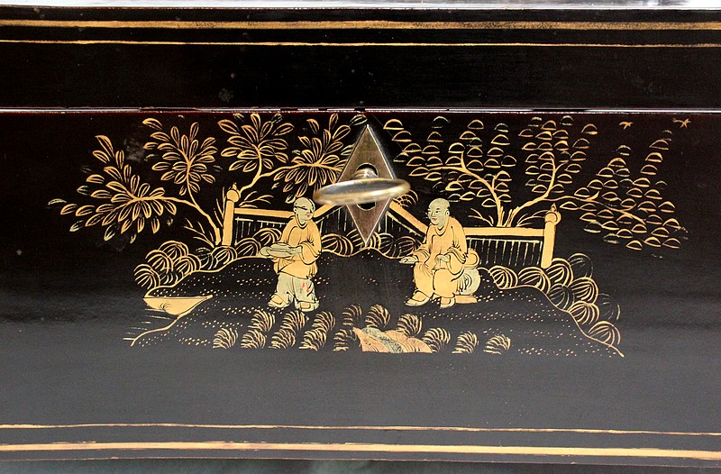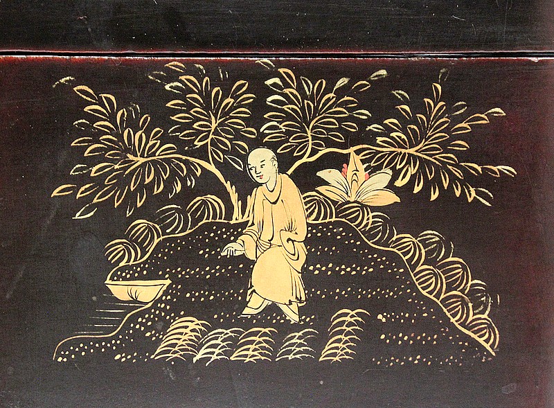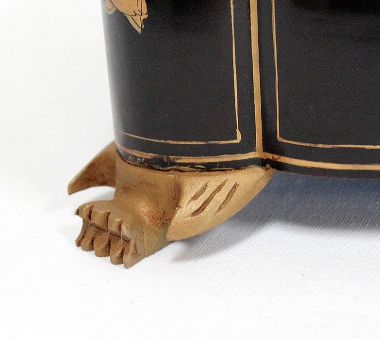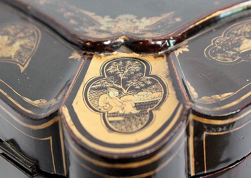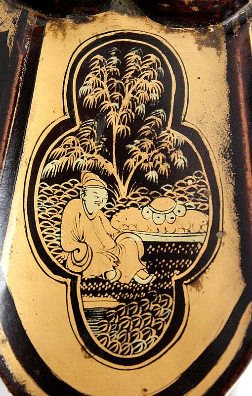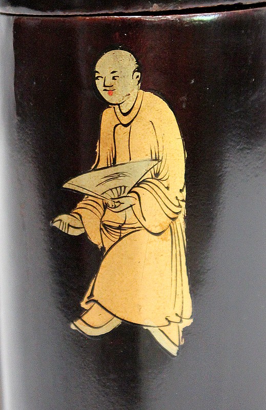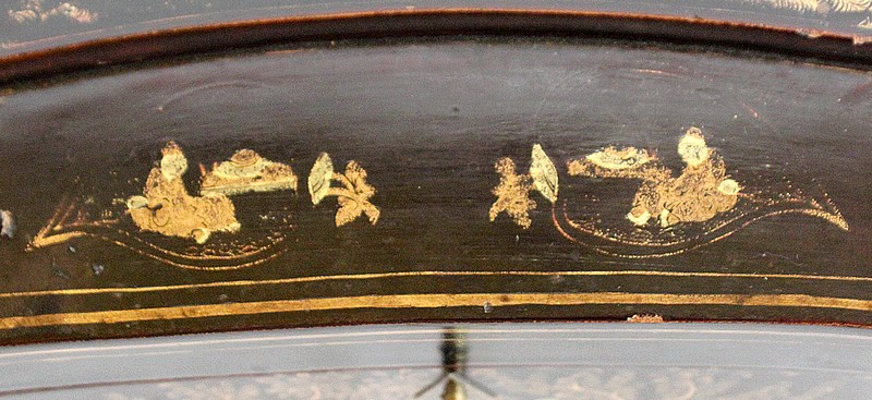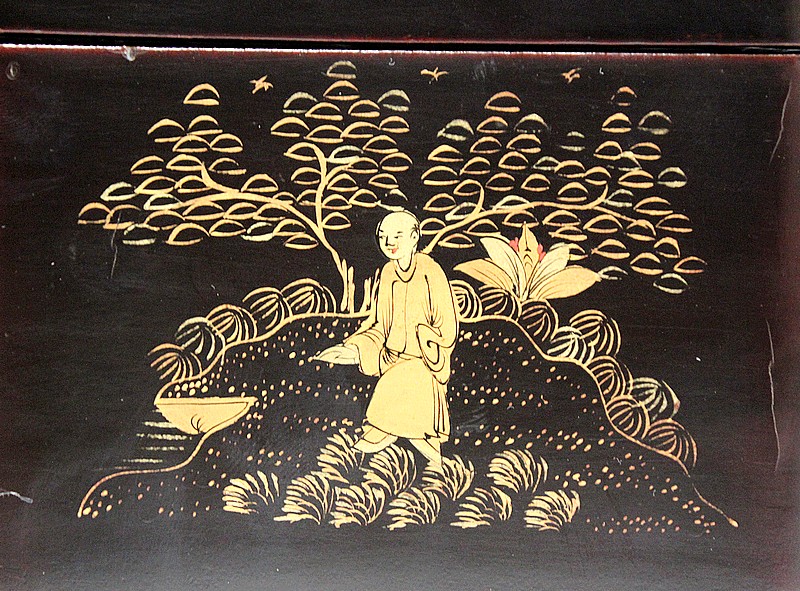 Il ouvre au-dessus par un Couvercle aux Reliefs Galbés, avec angles à Ressauts taillés en Demi-Rond. Ces coins s’embellissent de fins Décors Polychromes Orientaux, représentant des Fleurs et des Scènettes de la vie Japonaise. En son centre, l’Ouvrant s’agrémente d’un dessin représentant certainement une Ville, partiellement effacé avec le temps.