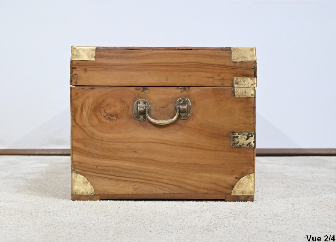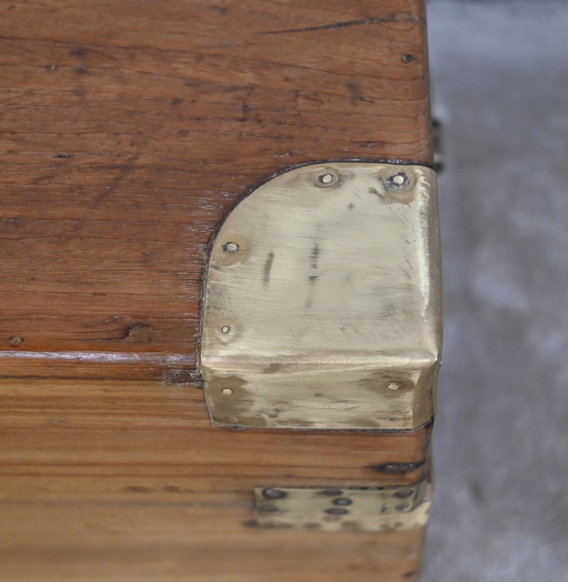 La façade, les côtés et l’arrière comprennent chacun une seule planche et sont également renforcés de lanières de différentes tailles et d’angles en demi-rond en laiton.