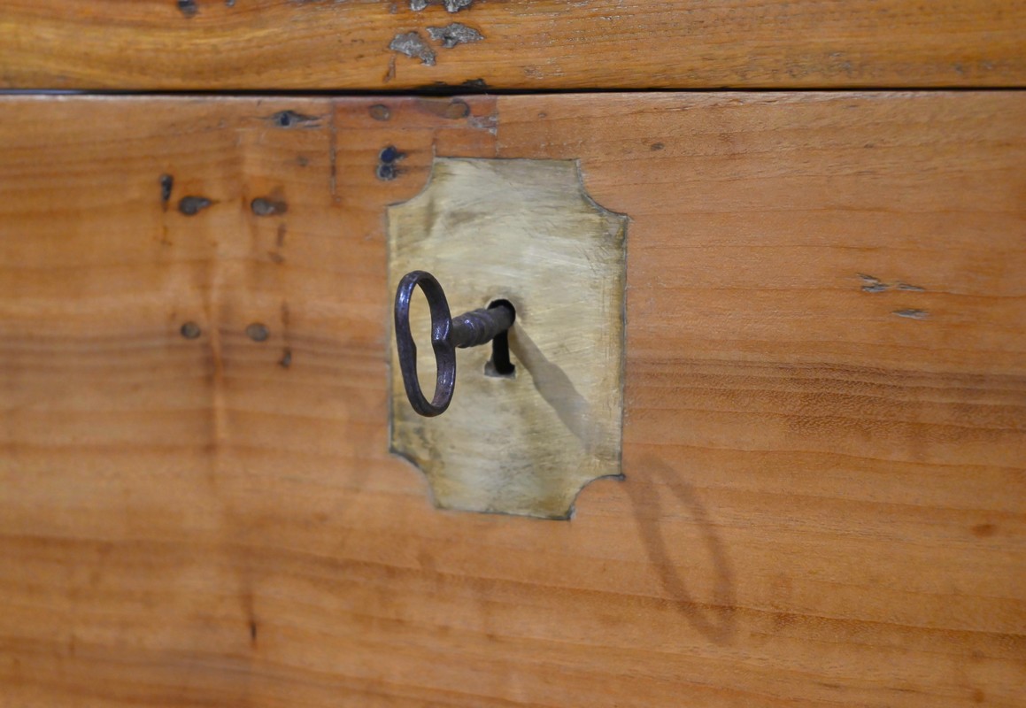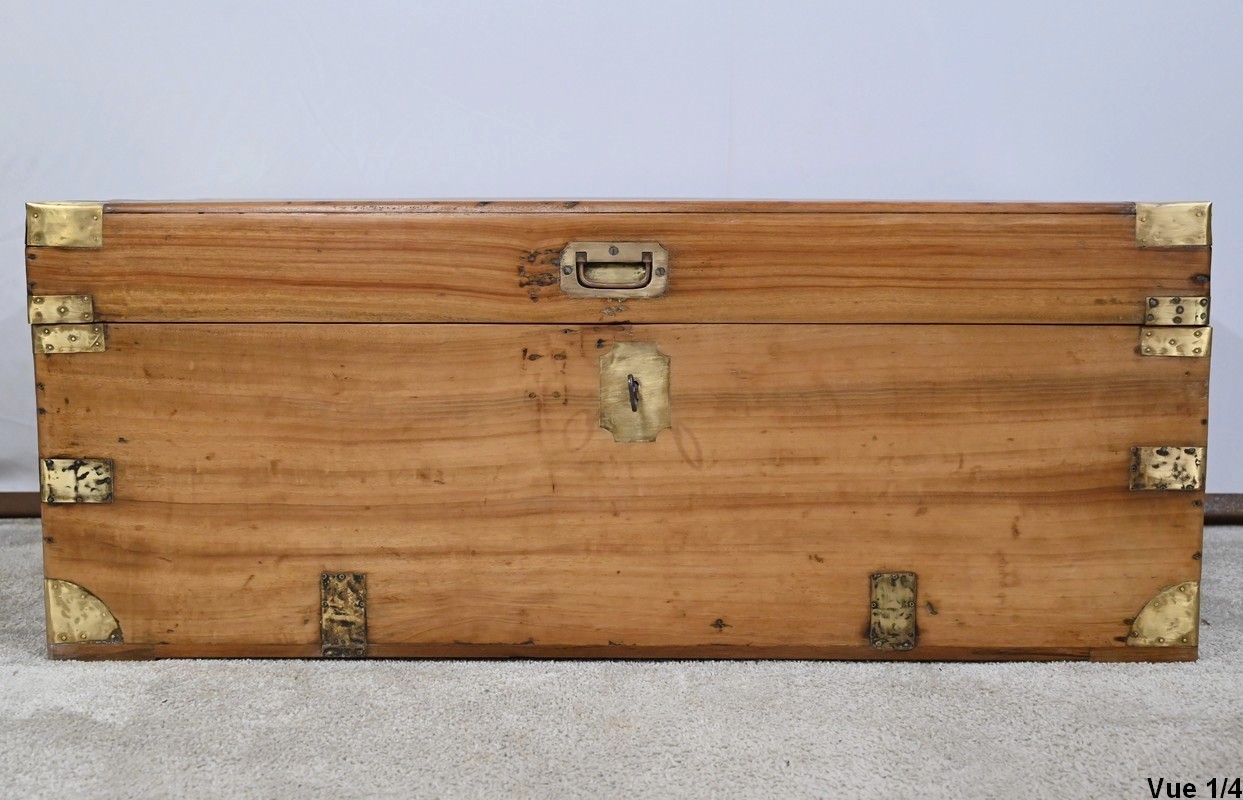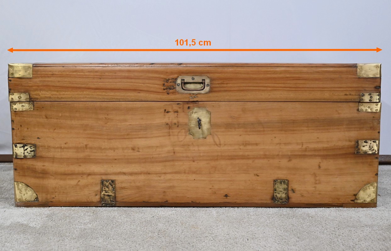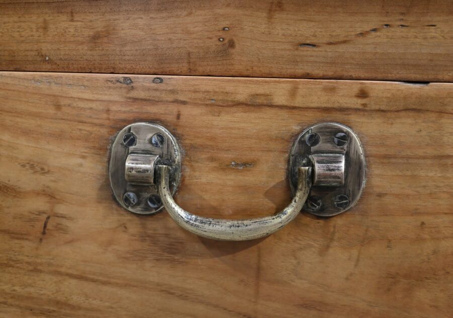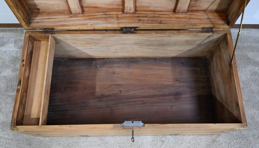 Ce coffre dispose d’une poignée bateau en laiton ainsi qu’une serrure d’origine fonctionnelle à quart de tour avec clé et entrée encastrée.