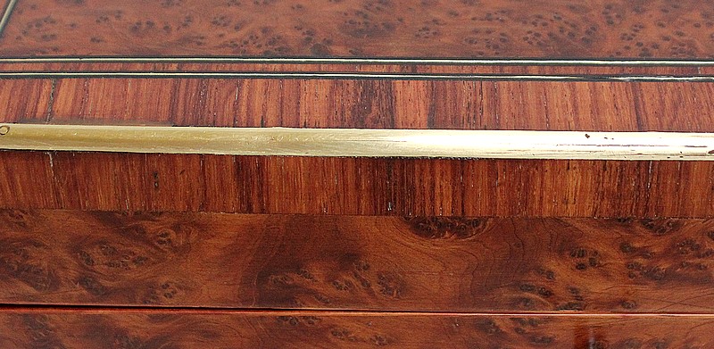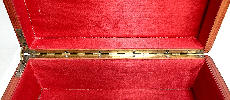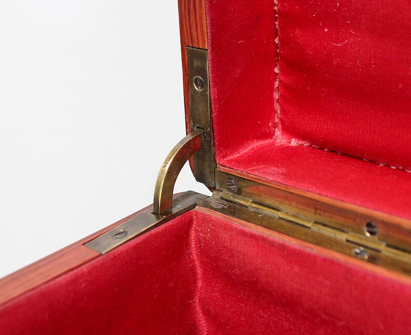 Ce coffret ouvre sur le Dessus par un couvercle bordé d’un Épais Filet de Laiton. Celui-ci entoure une Frise de Bois de Rose, juxtaposée elle aussi de deux autres Filets de Laiton. En son centre, l’Ouvrant est agrémenté d’un Losange en Ébène, lui-même incrusté de Motifs très Raffinés, présentant les mêmes essences décrites plus haut. Ce dernier décor est serti de discrets Cristaux de Nacre.