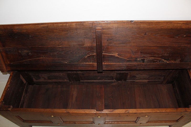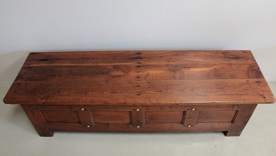 Longue maie en châtaignier, façade à 4 panneaux ornée de gros clous en cuivre.