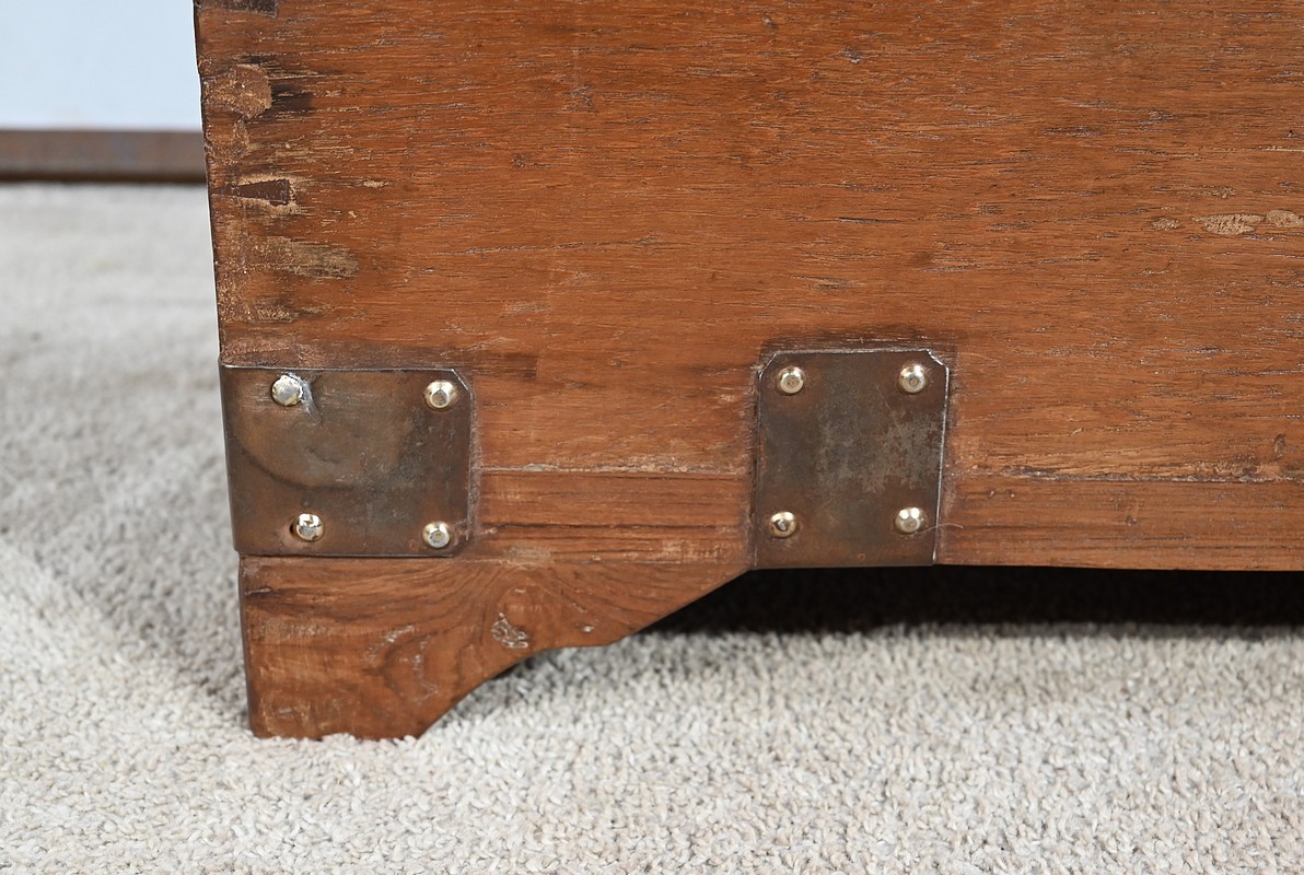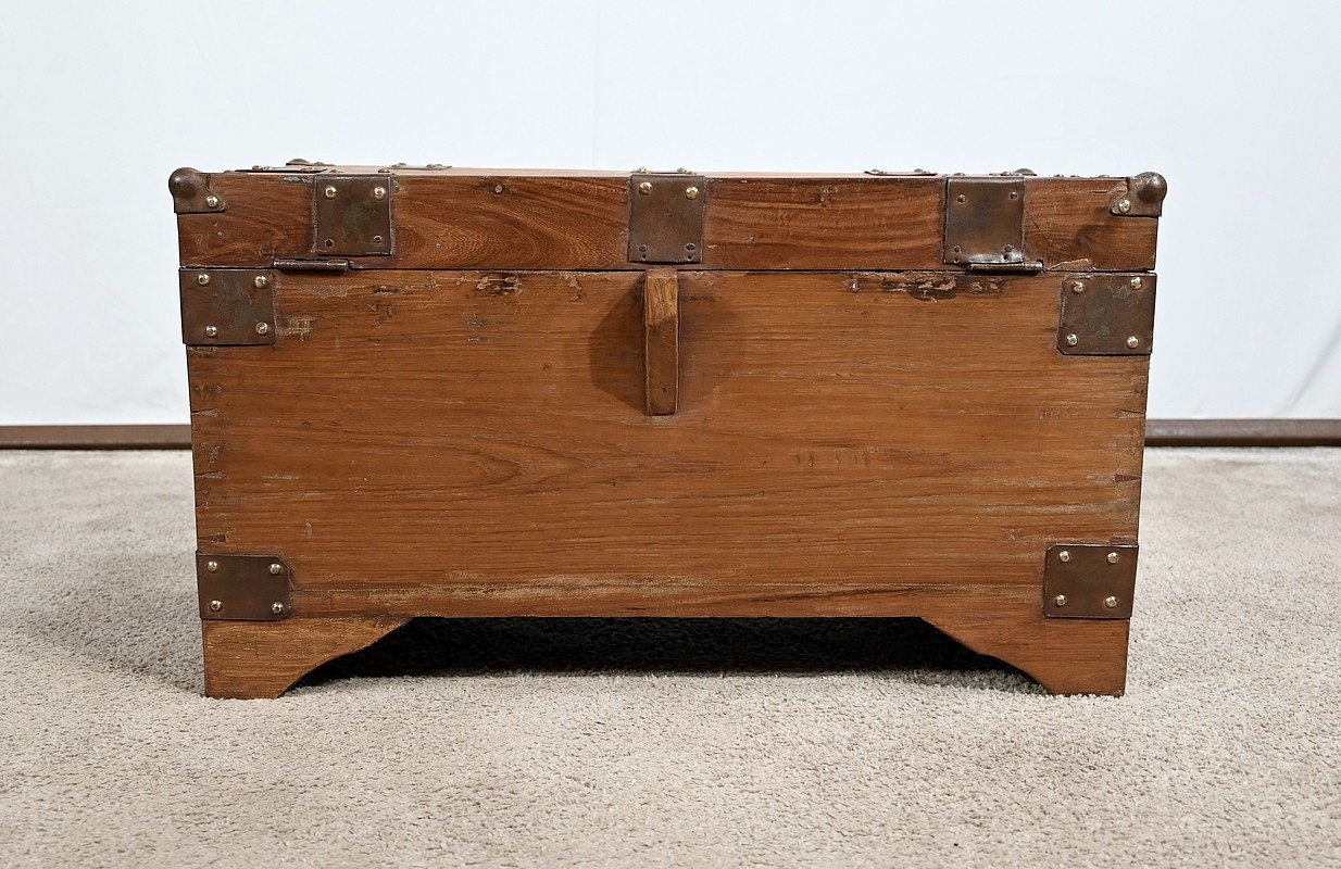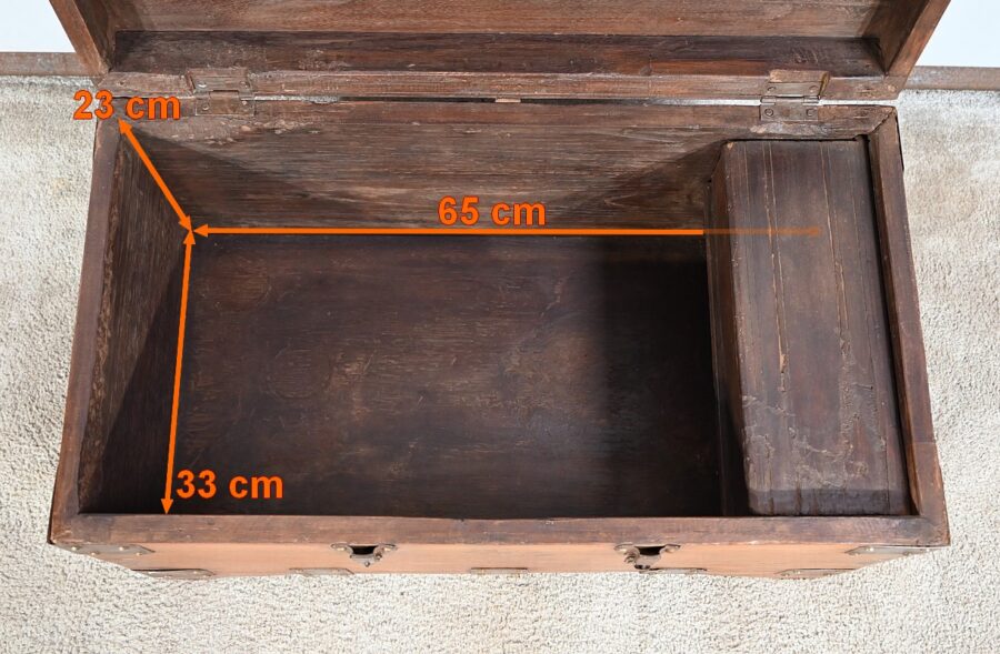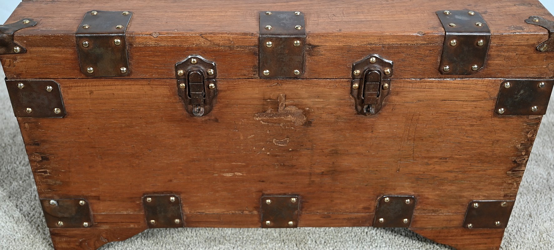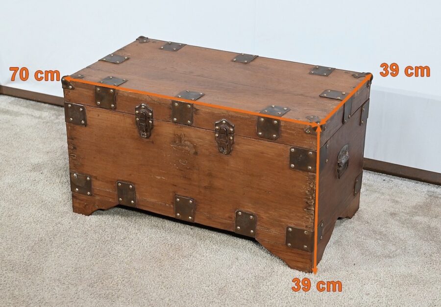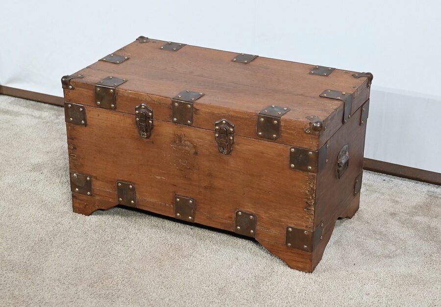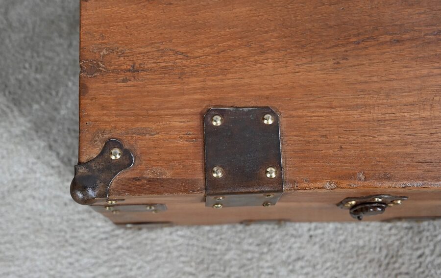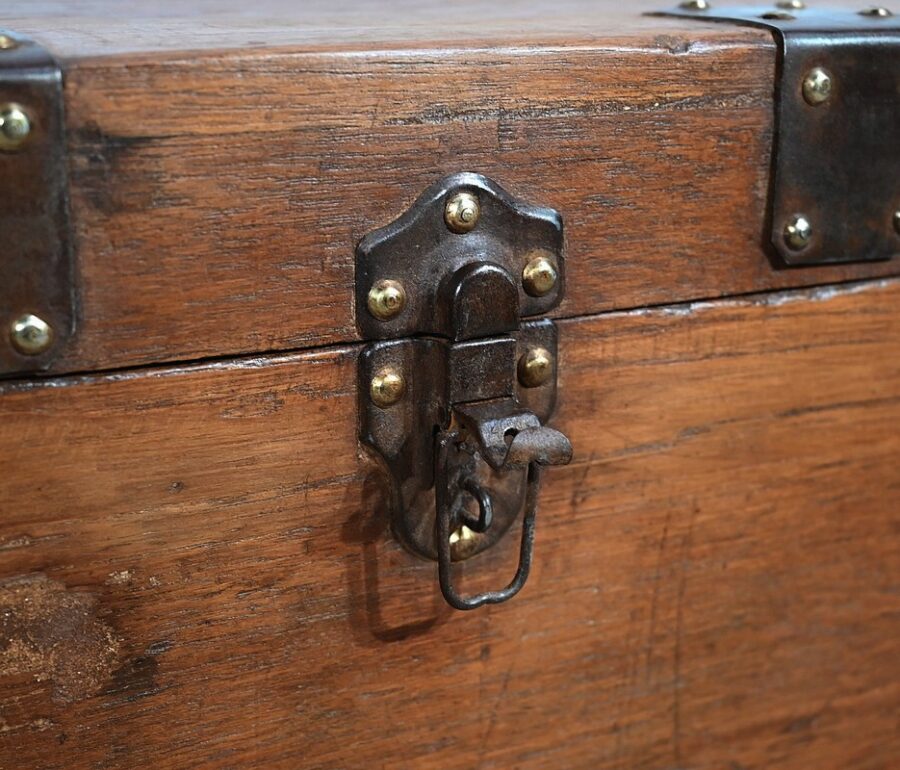 Assemblées à queue d’aronde les faces en teck de ce coffre sont reliées solidement. A l’ouverture, nous découvrons un grand espace de rangement avec un casier latéral.