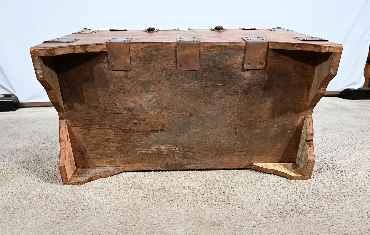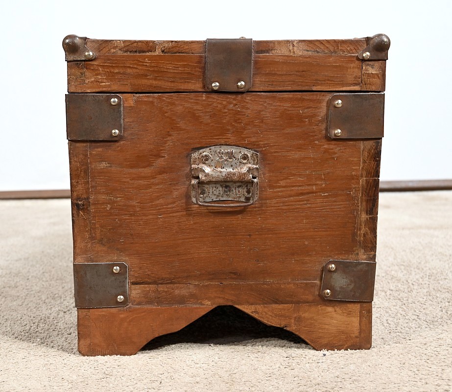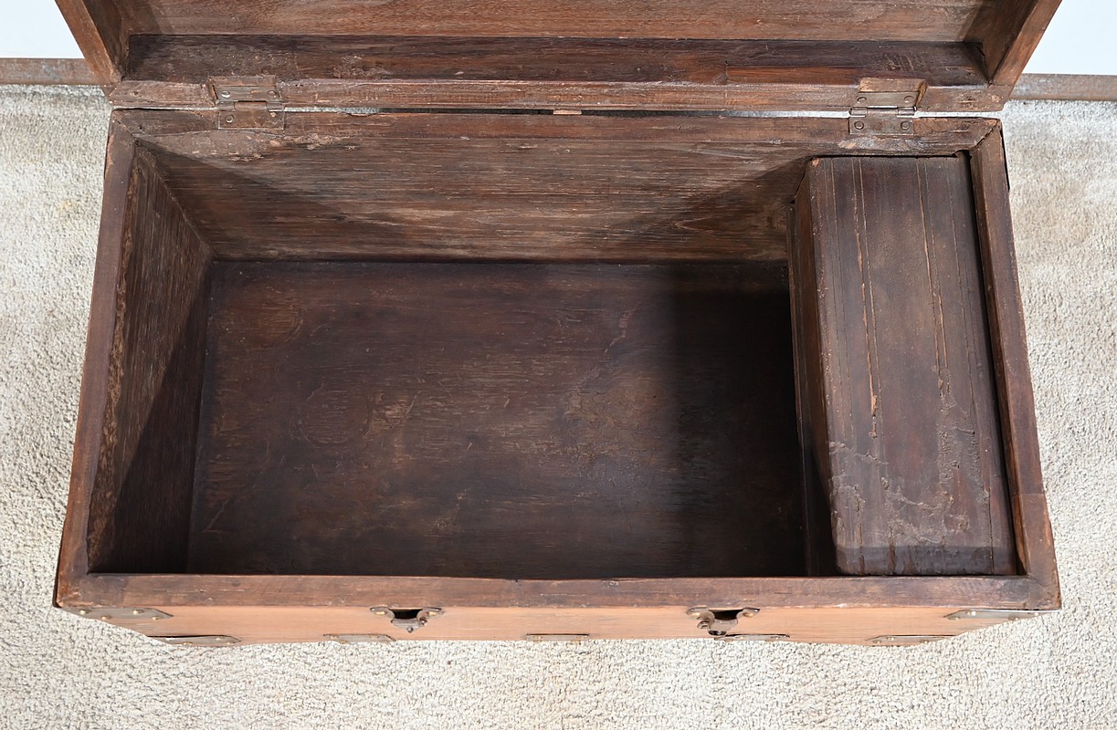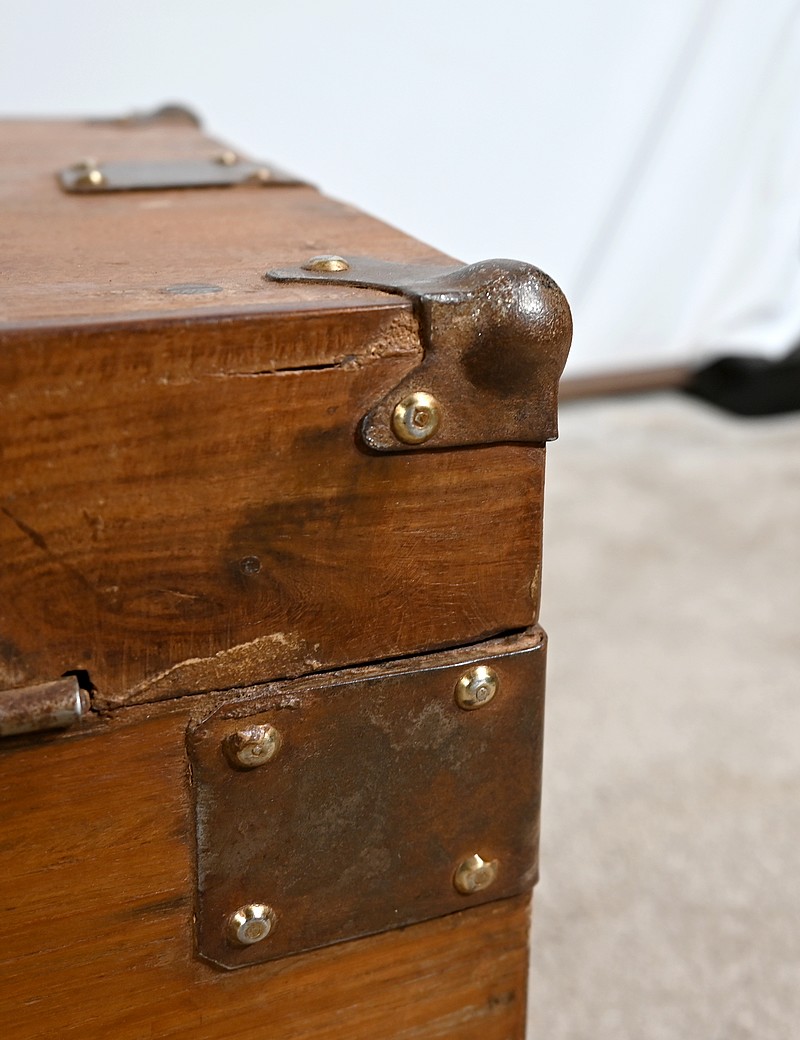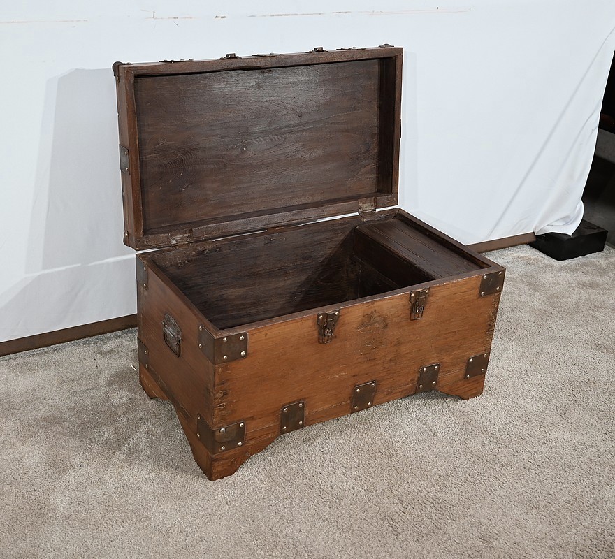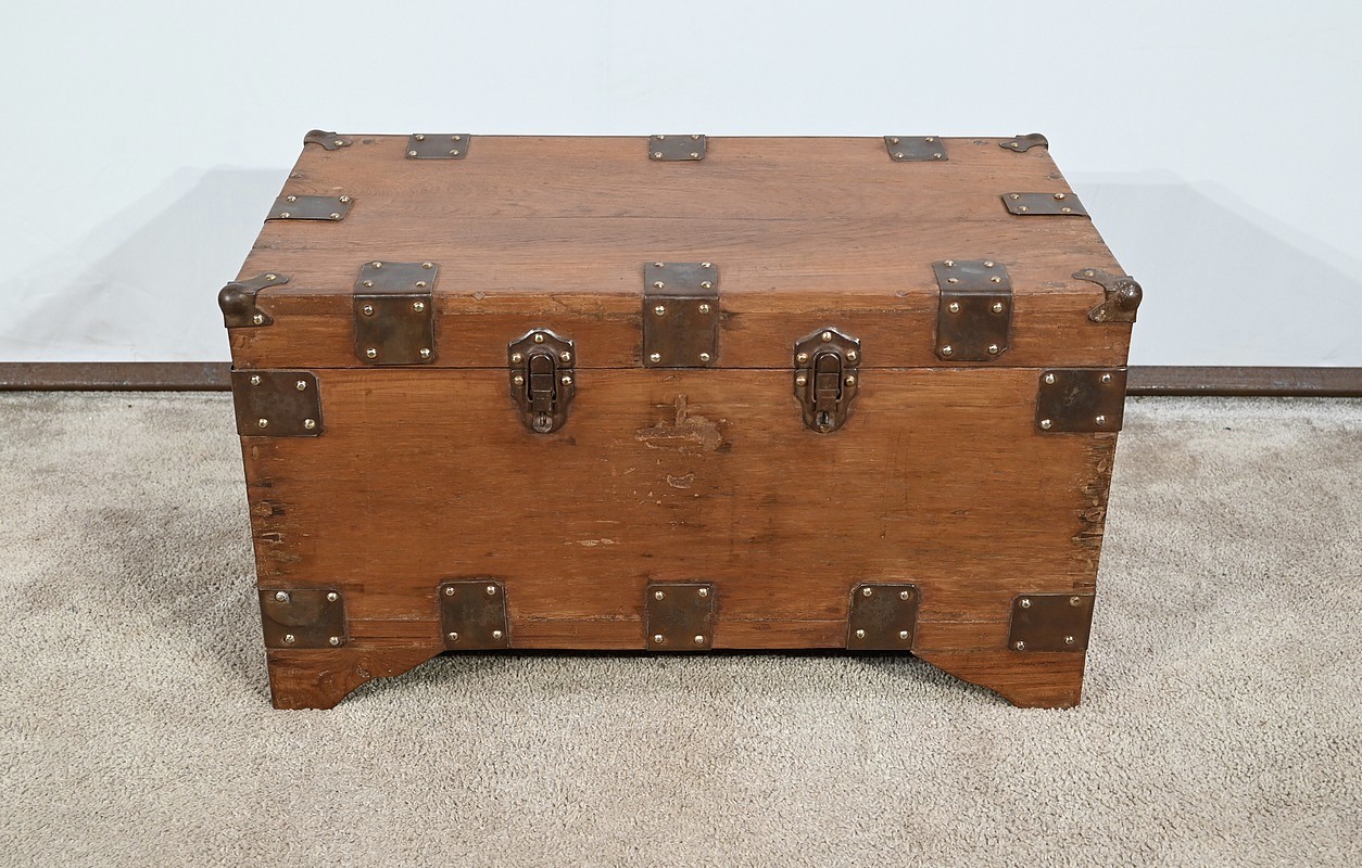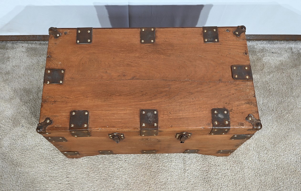 Assemblées à queue d’aronde les faces en teck de ce coffre sont reliées solidement. A l’ouverture, nous découvrons un grand espace de rangement avec un casier latéral.