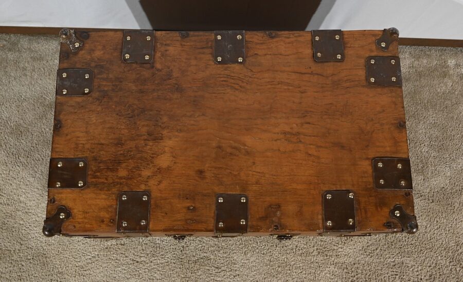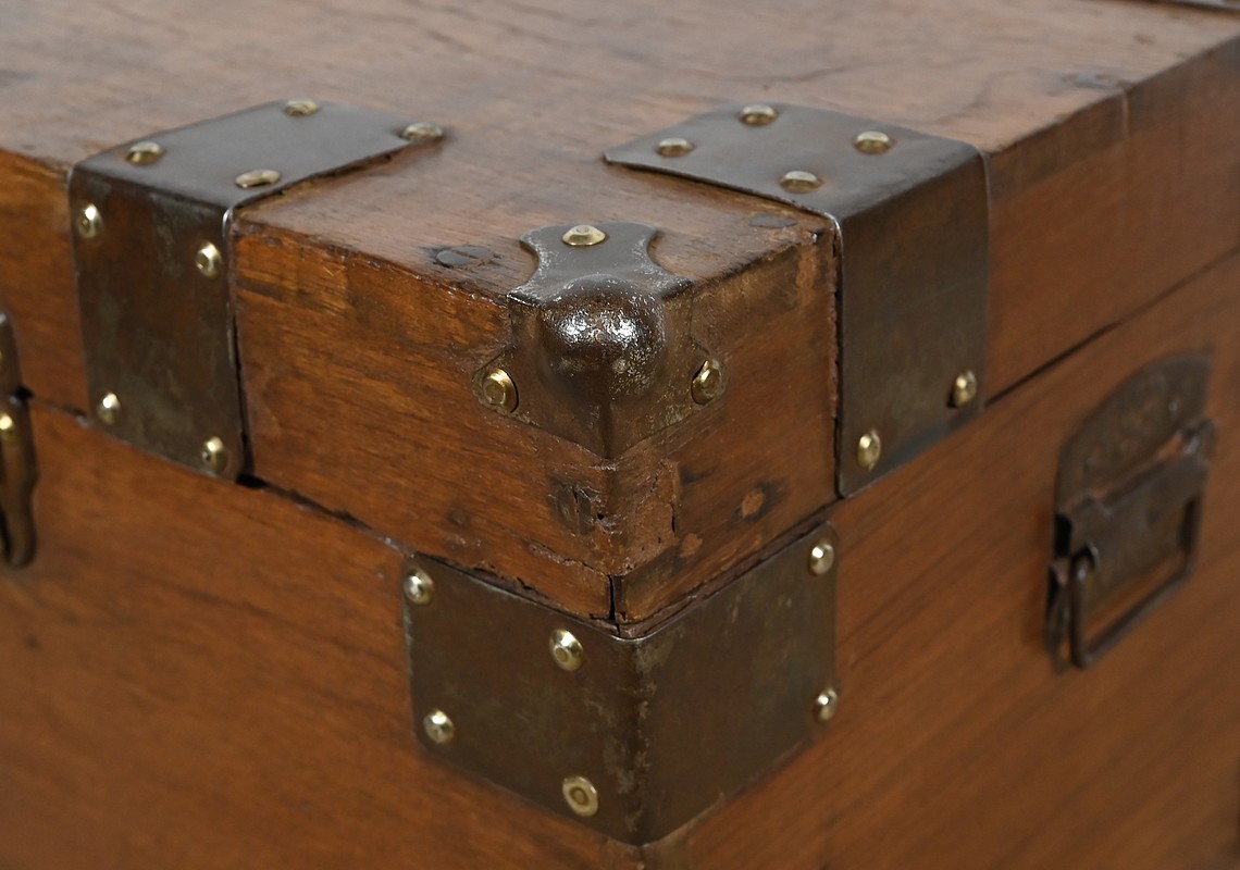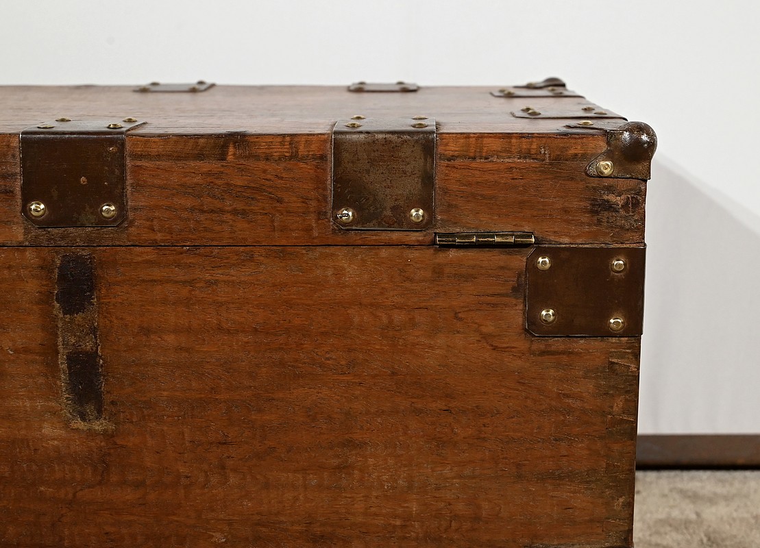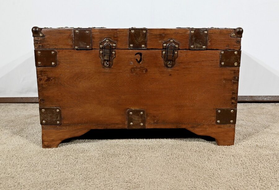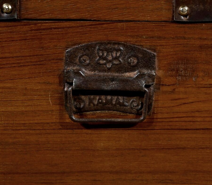 Assemblées à queue d’aronde les faces en teck de ce coffre sont reliées solidement. A l’ouverture, nous découvrons un grand espace de rangement.