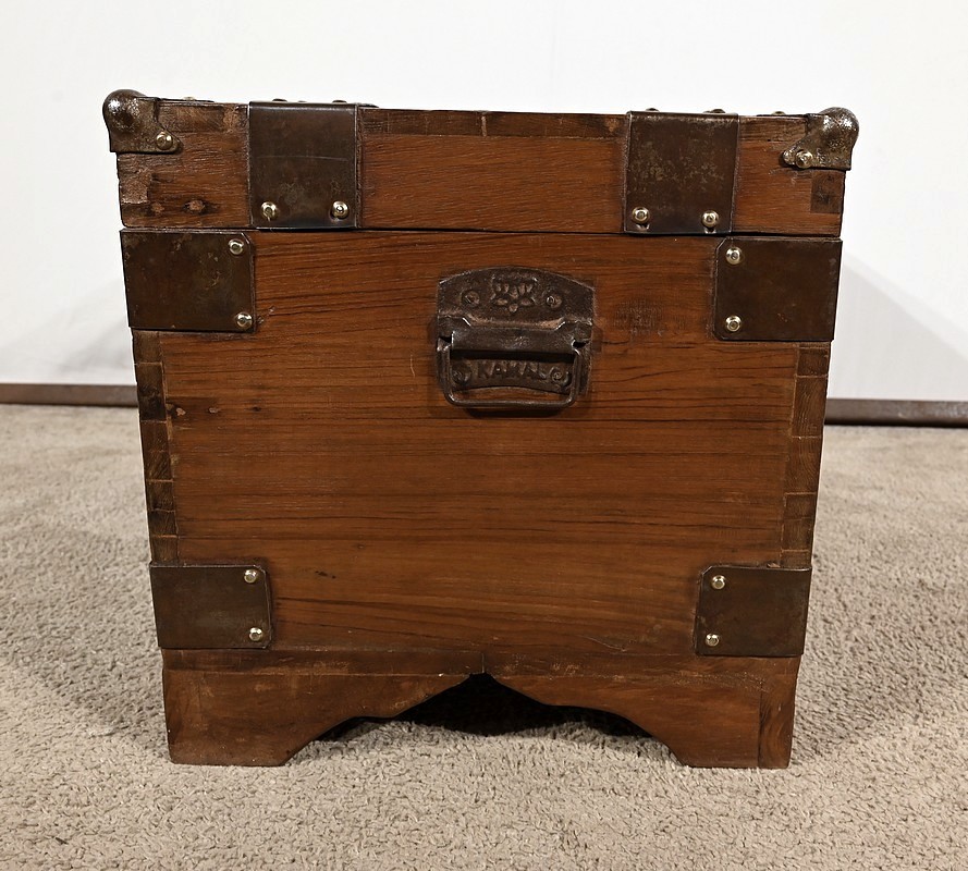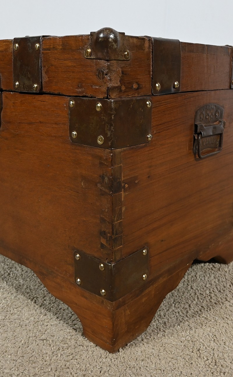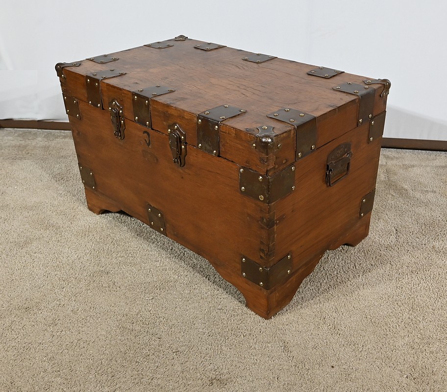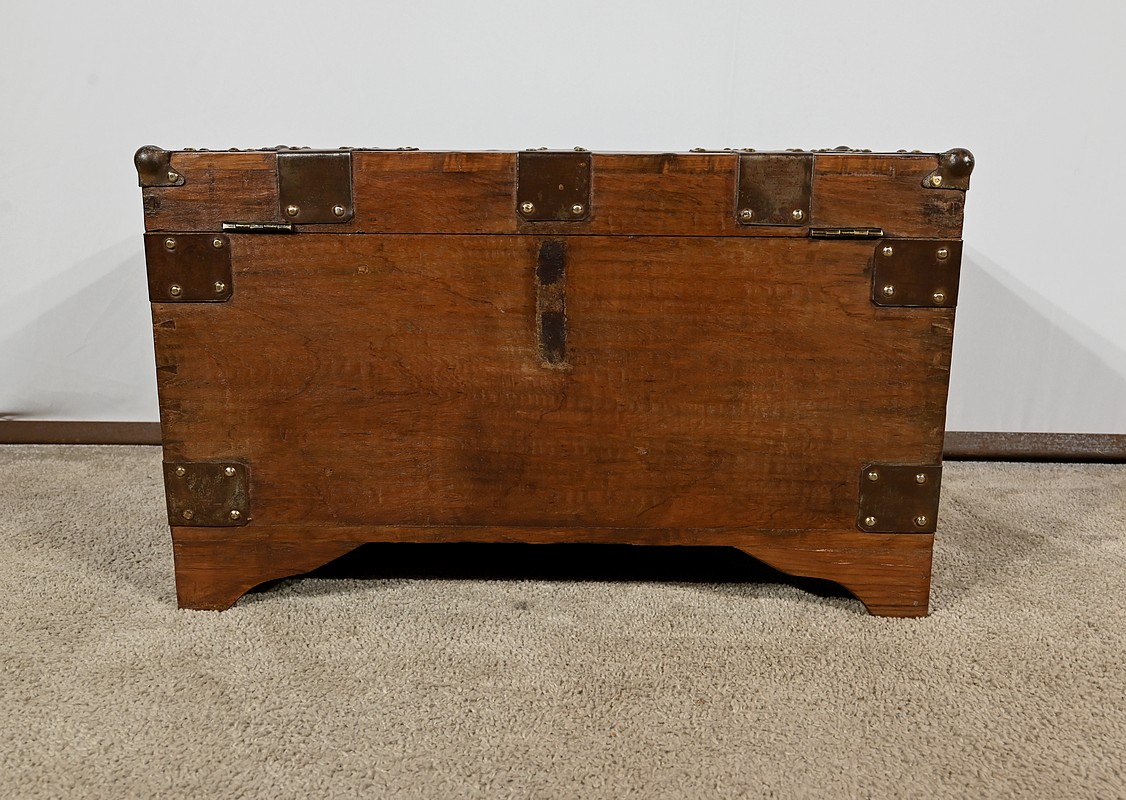 Assemblées à queue d’aronde les faces en teck de ce coffre sont reliées solidement. A l’ouverture, nous découvrons un grand espace de rangement.