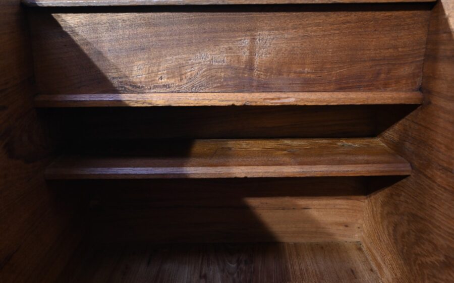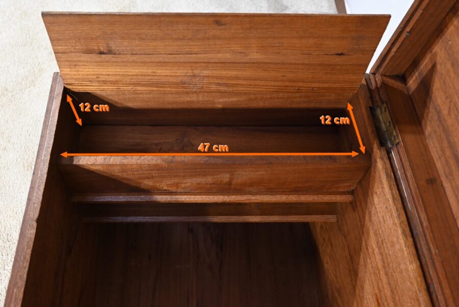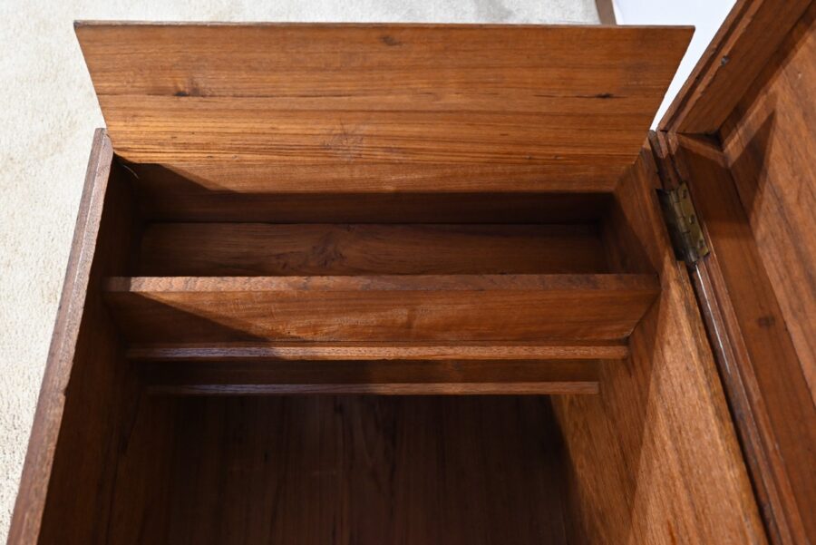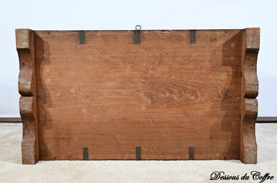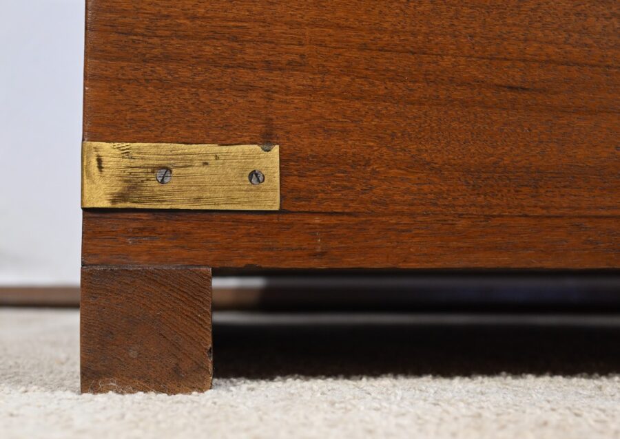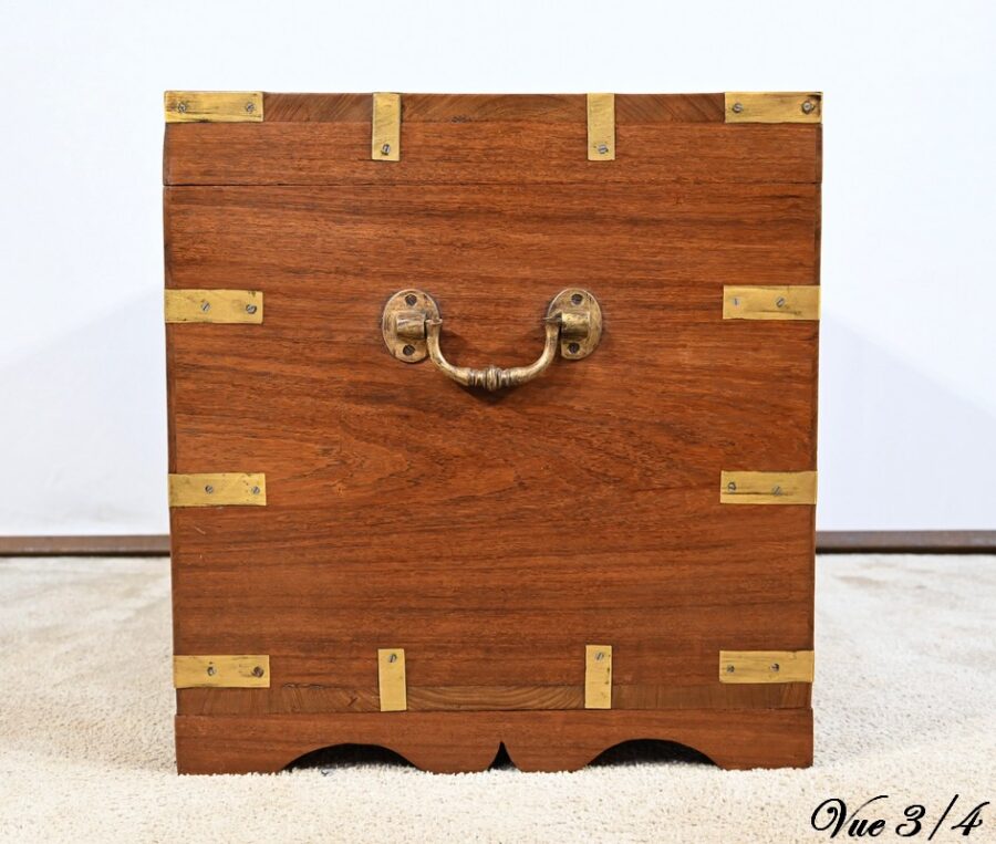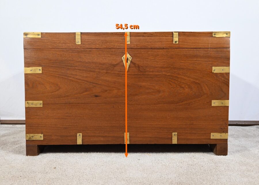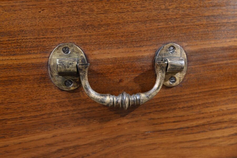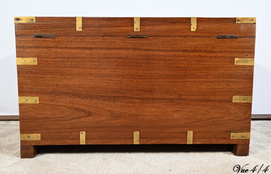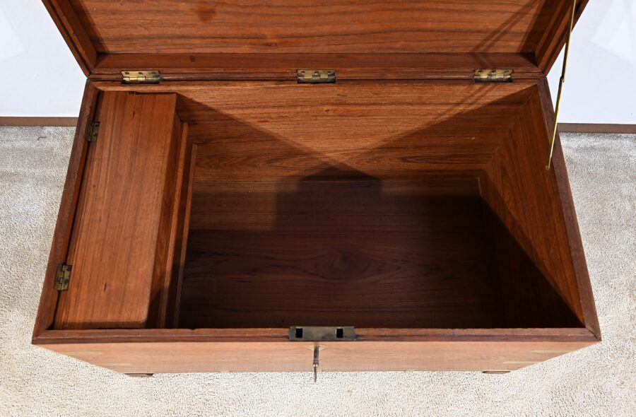 Ce coffre de grande qualité est muni d’une poignée de portage en fer sur chaque côté. Il repose sur des éléments découpés en teck formant des pieds.