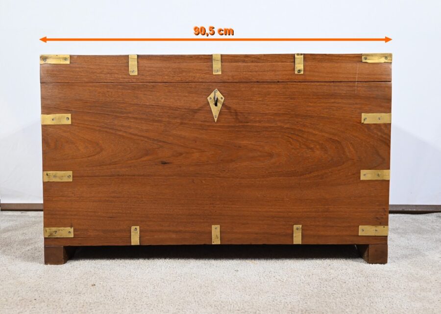 Gage de solidité, les angles de ce coffre en teck massif, sont agrémentés de lanières en laiton.