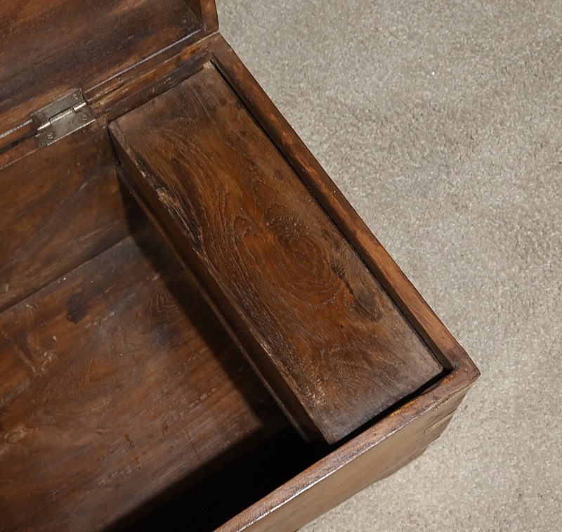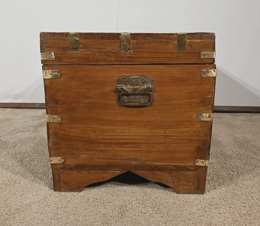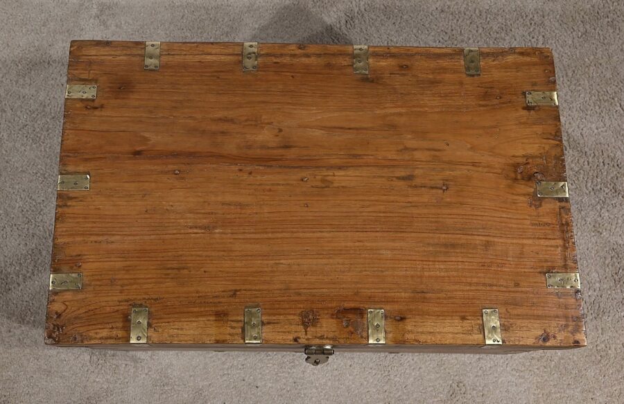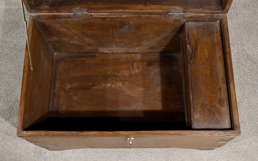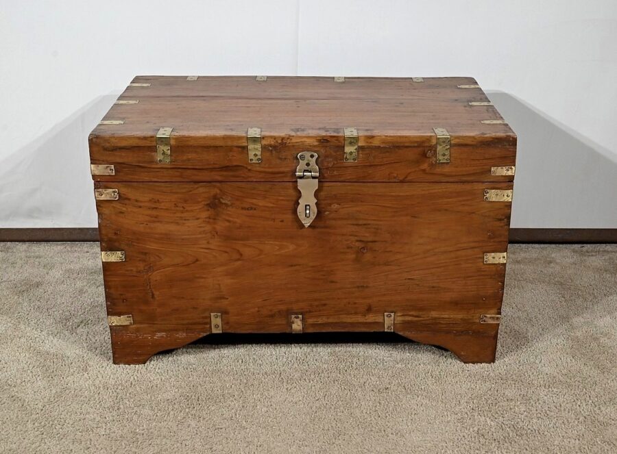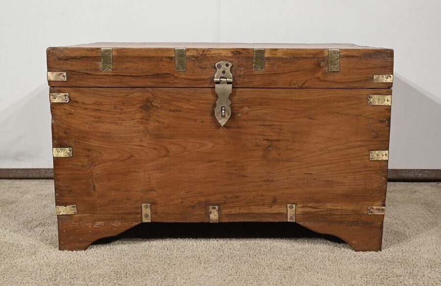 Ce coffre de grande qualité est muni d’une poignée de portage en fer sur chaque côté. Il repose sur des éléments découpés en teck formant des pieds.