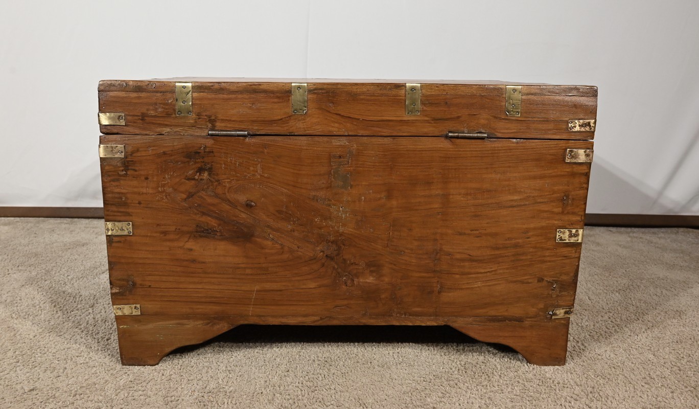 Gage de solidité, les angles de ce coffre en teck massif, sont agrémentés de lanières en laiton.