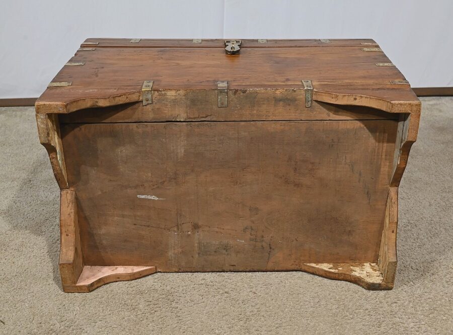 Le couvercle, monté sur deux larges charnières, est maintenu ouvert par un compas en laiton dit « à genou ».