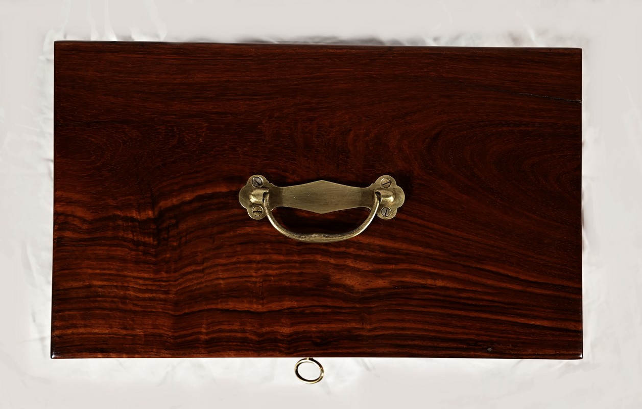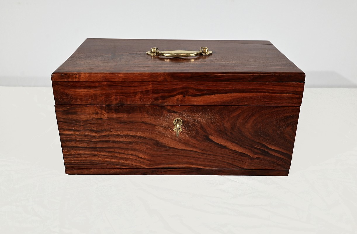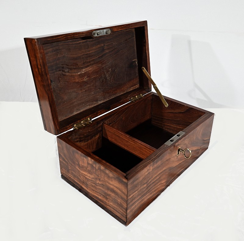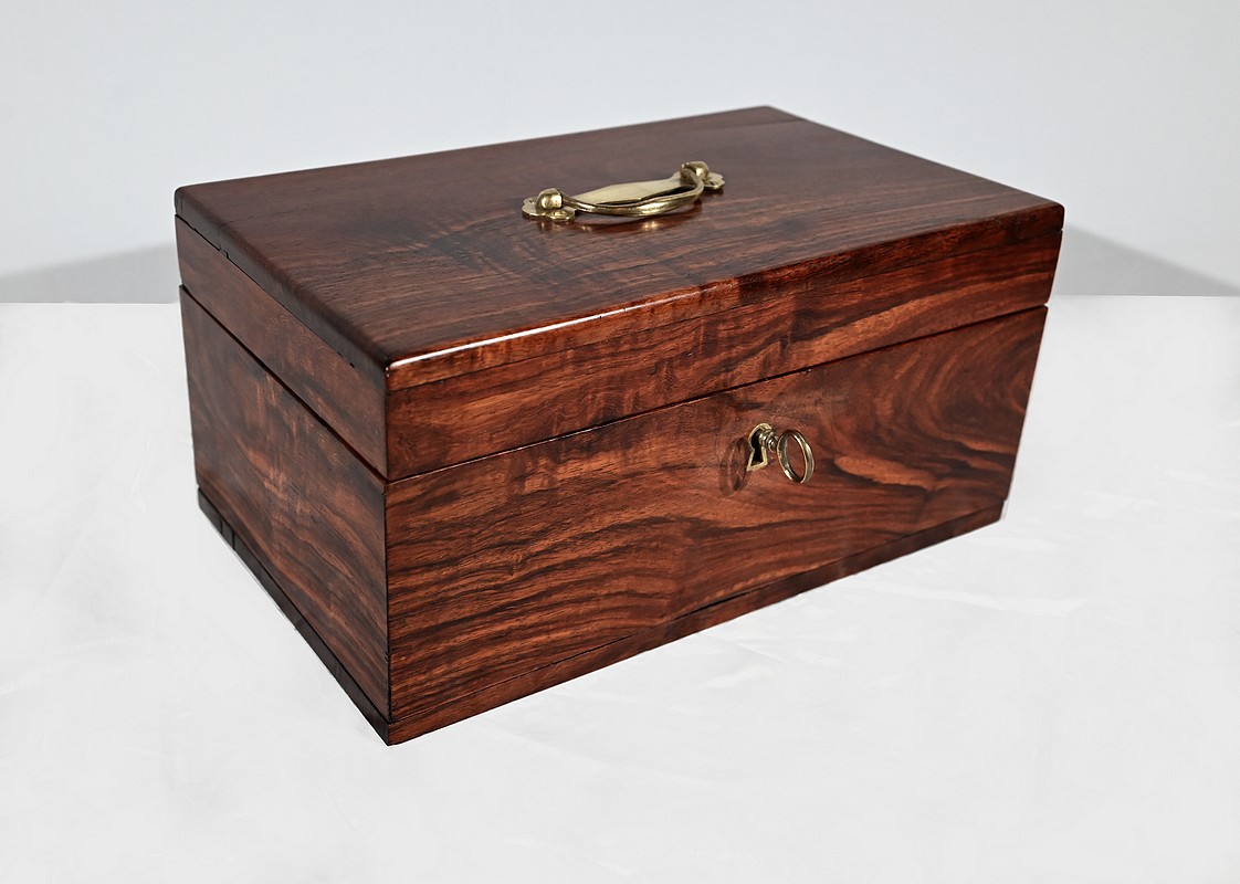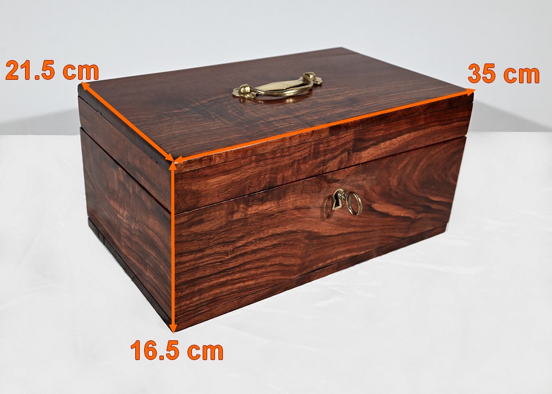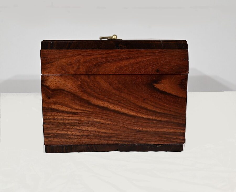 Charmant coffret en acajou massif, de forme rectangulaire. Les côtés et la façade sont assemblés à coupe d’onglet comme le cœur. L’ouverture se fait sur charnières en laiton et se maintient grâce à un compas à genou. A l’intérieur, nous découvrons deux casiers. La serrure de ce coffre est d’origine et à double crochet. Une entrée filet souligne le passage de la clé. Sur le dessus une poignée laiton permet le transport.