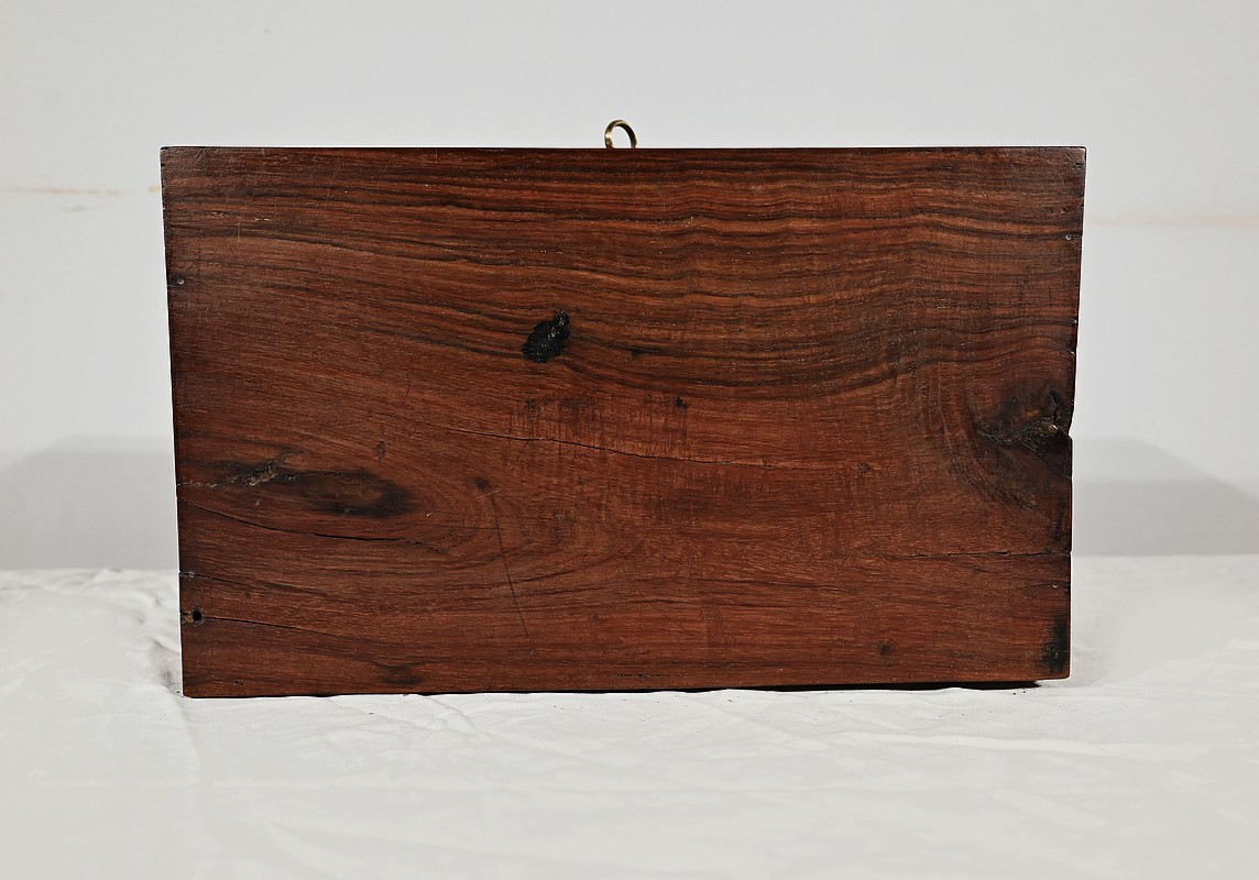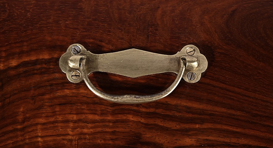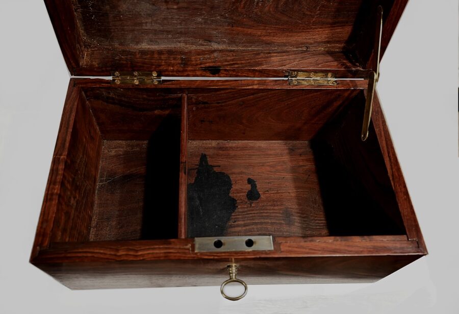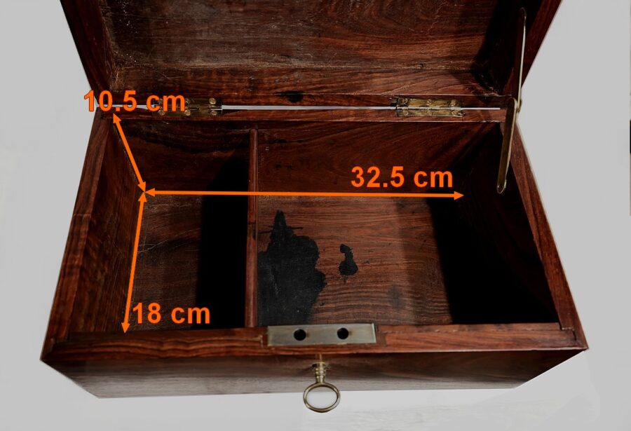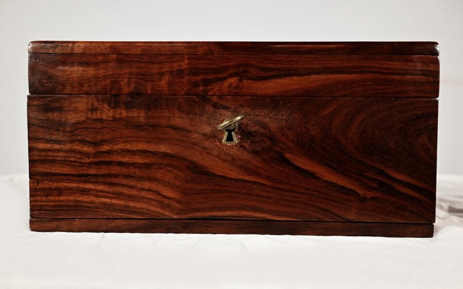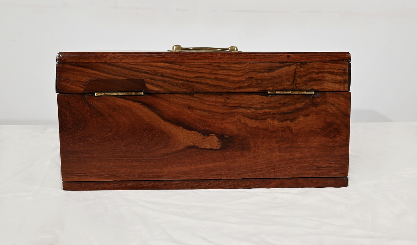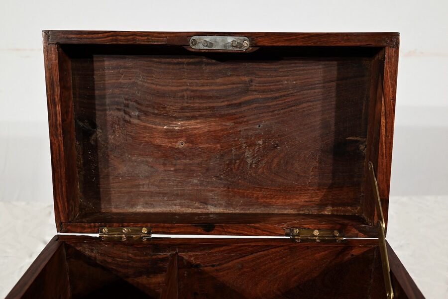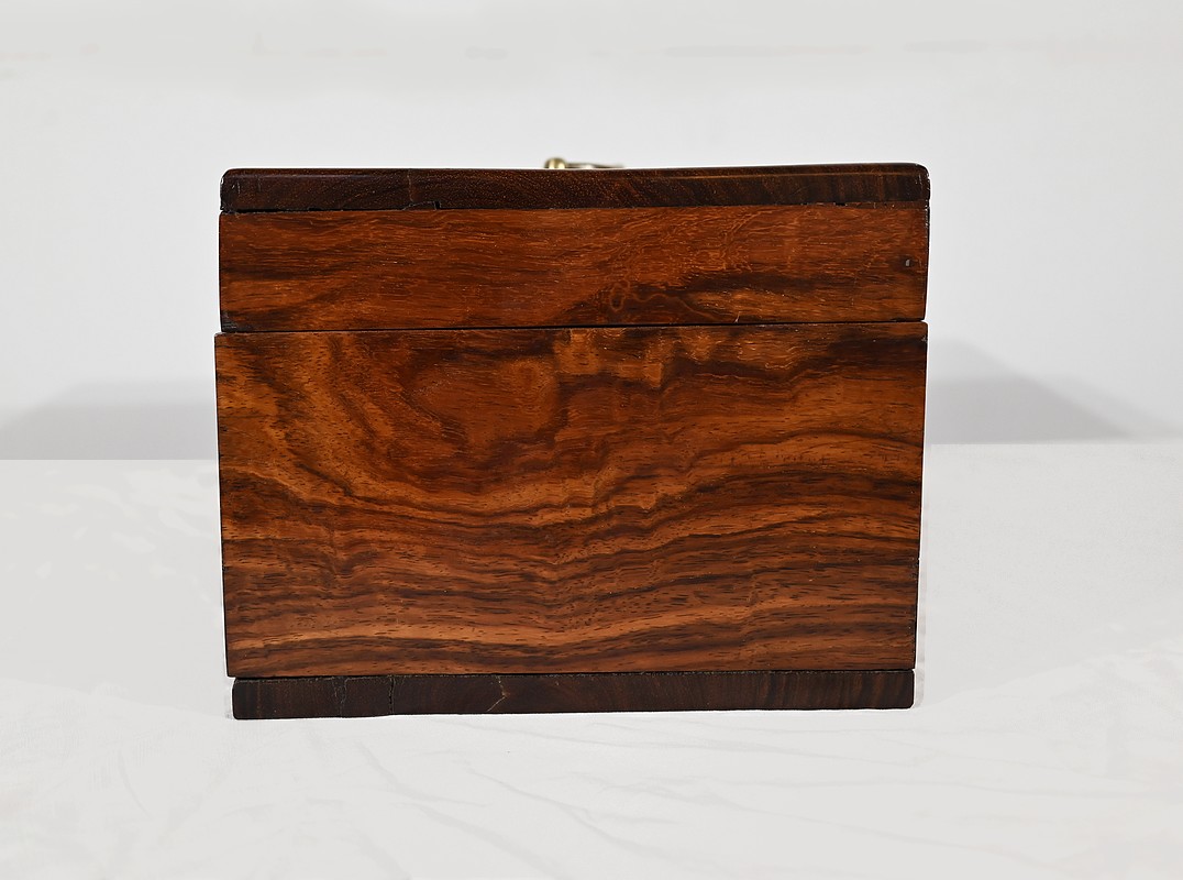 Charmant coffret en acajou massif, de forme rectangulaire. Les côtés et la façade sont assemblés à coupe d’onglet comme le cœur. L’ouverture se fait sur charnières en laiton et se maintient grâce à un compas à genou. A l’intérieur, nous découvrons deux casiers. La serrure de ce coffre est d’origine et à double crochet. Une entrée filet souligne le passage de la clé. Sur le dessus une poignée laiton permet le transport.