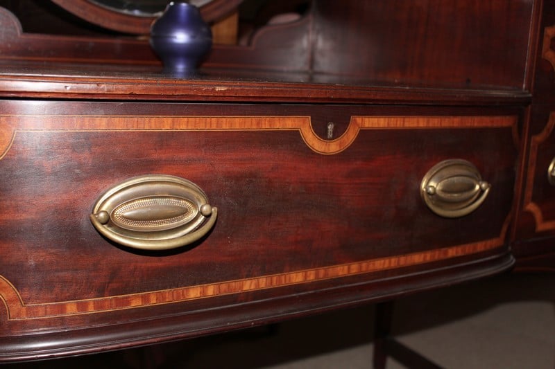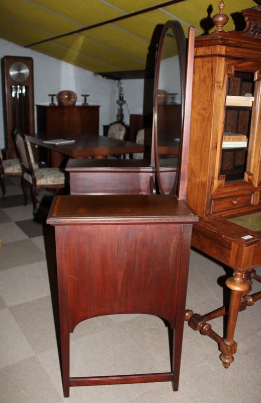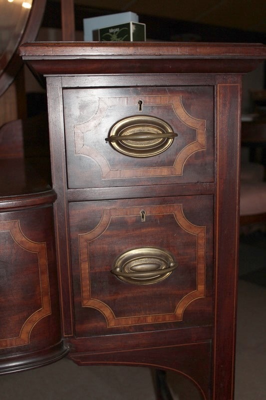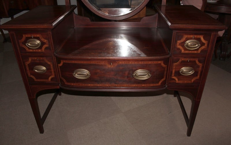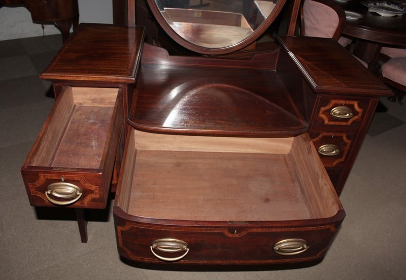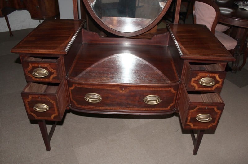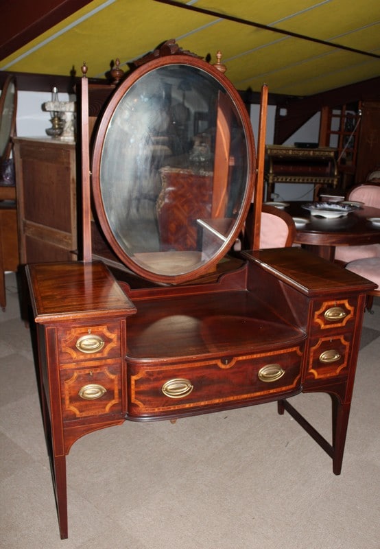 Coiffeuse anglaise en acajou à grand miroir ovale ouvrant par un grand tiroir au milieu et deux plus petits de chaque côté, tous très profonds et garnis de poignées en laiton. Elle est décorée d’un filet de bois de rose. Angleterre, époque 1900.
