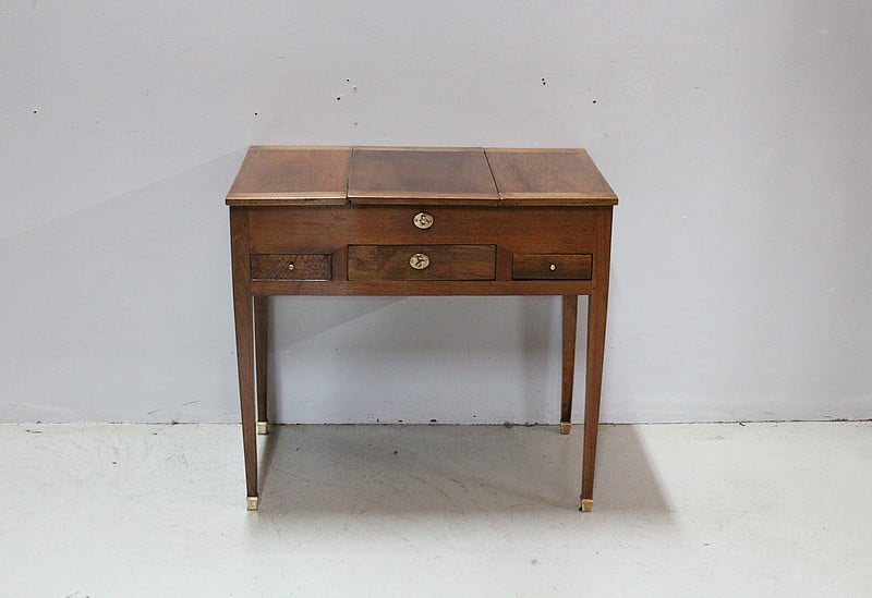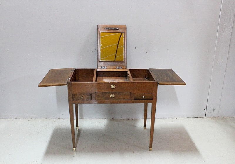 En dessous, la coiffeuse ouvre par 2 tiroirs dont un central fermant à clef et un faux tiroir à sa gauche.