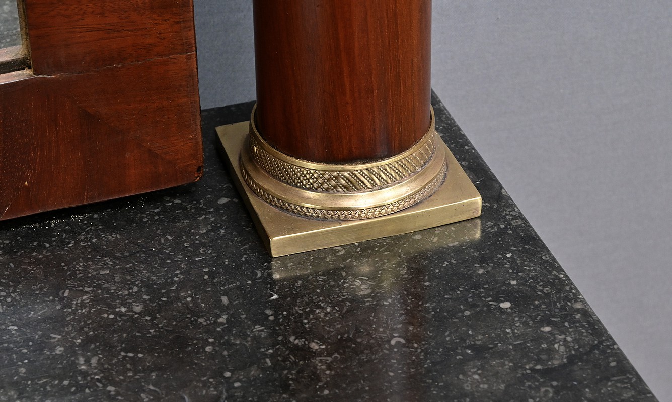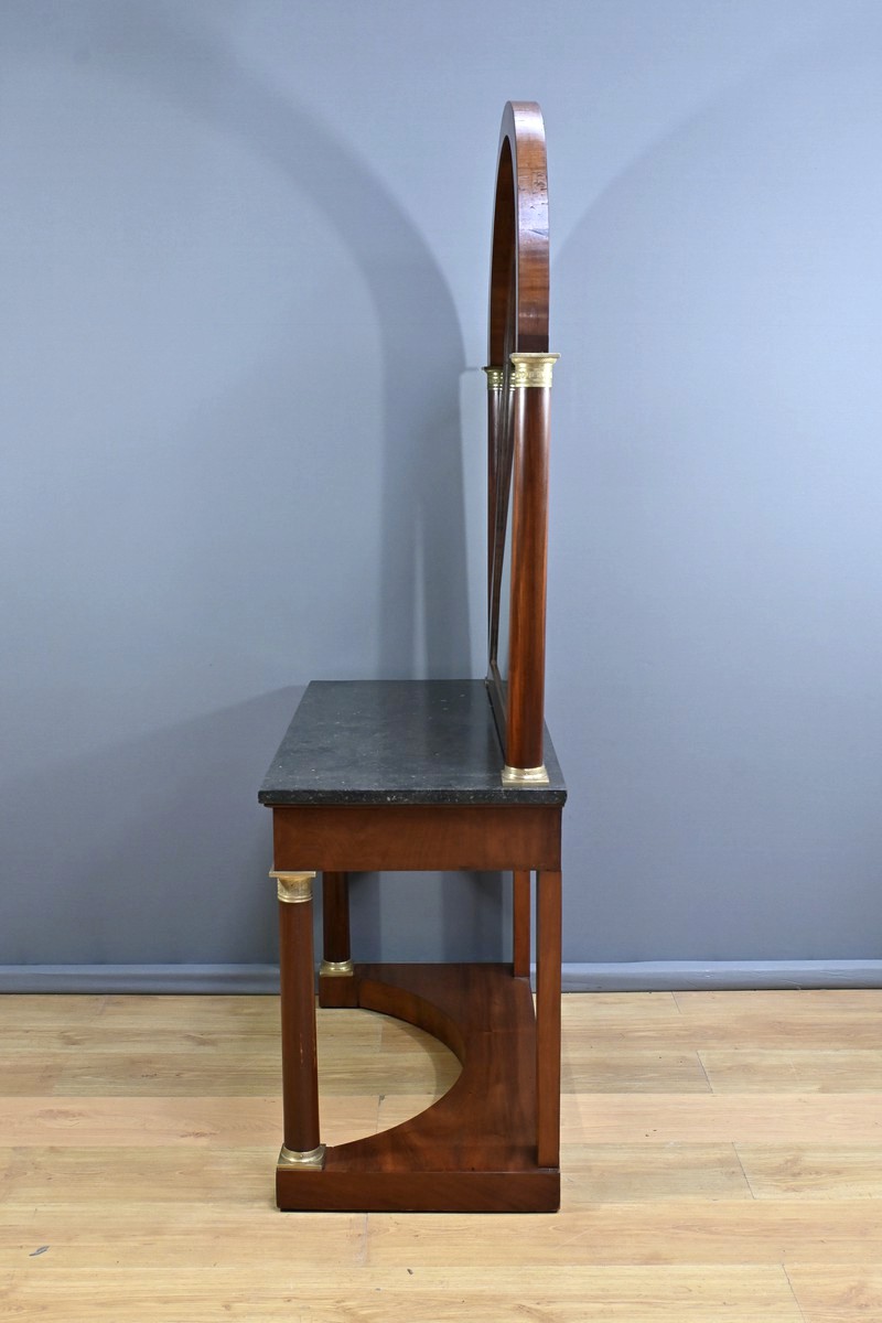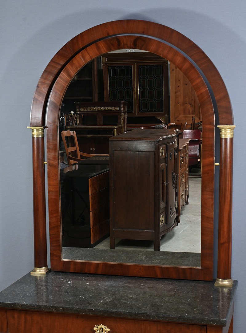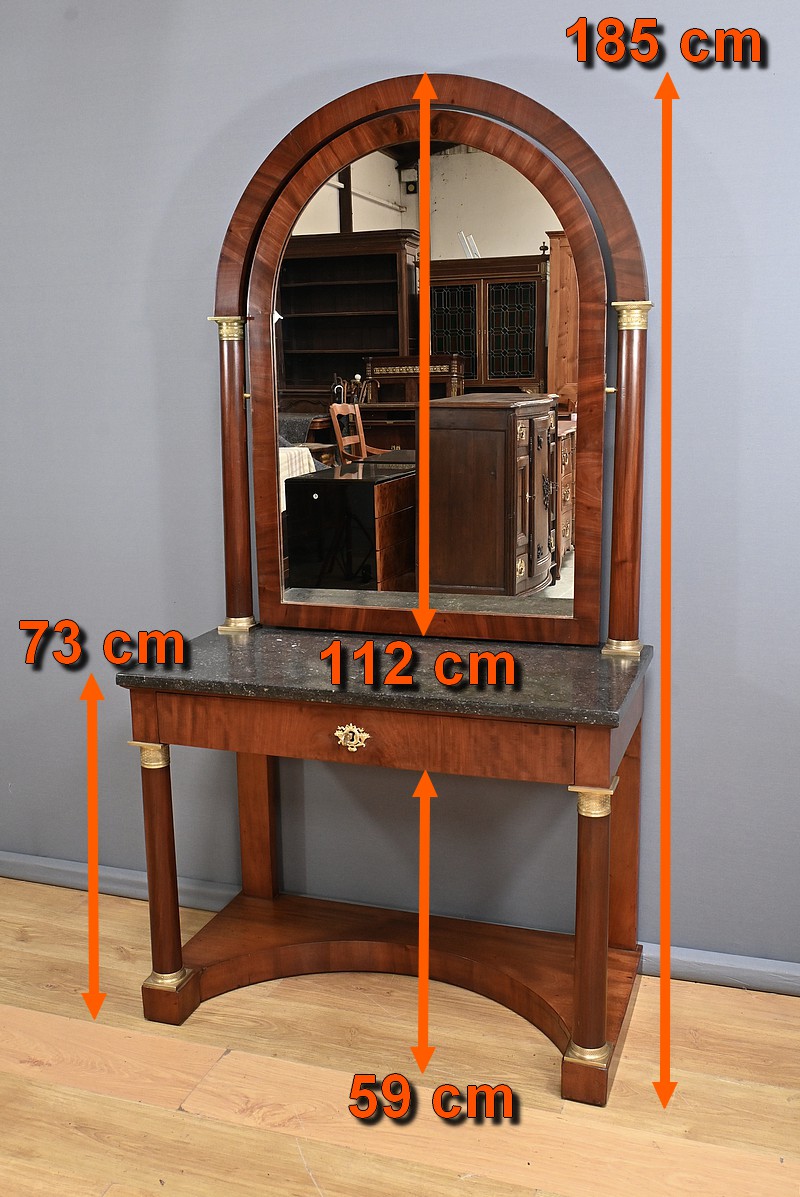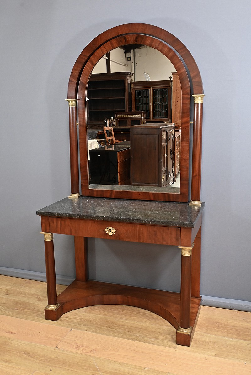 Superbe coiffeuse Empire en acajou et placage de ronce d’acajou doté d’un grand miroir pivotant de forme rectangulaire avec arche en partie supérieure. Cette glace est entourée de colonnes agrémentées de bagues ciselées en bronze en partie haute et basse. Elles sont surmontées d’un arc en acajou suivant les lignes du miroir. Cet ensemble repose sur un marbre granité belge surmontant la ceinture ouvrant par un tiroir. Ce dernier est équipé d’une serrure fonctionnelle, d’une clé et entrée en bronze doré finement ouvragées. Cette coiffeuse possède des colonnes à l’avant garnies de bagues et collerettes en bronze. A l’arrière les pieds sont droits. Ils reposent sur une base concave assurant stabilité à l’ensemble.